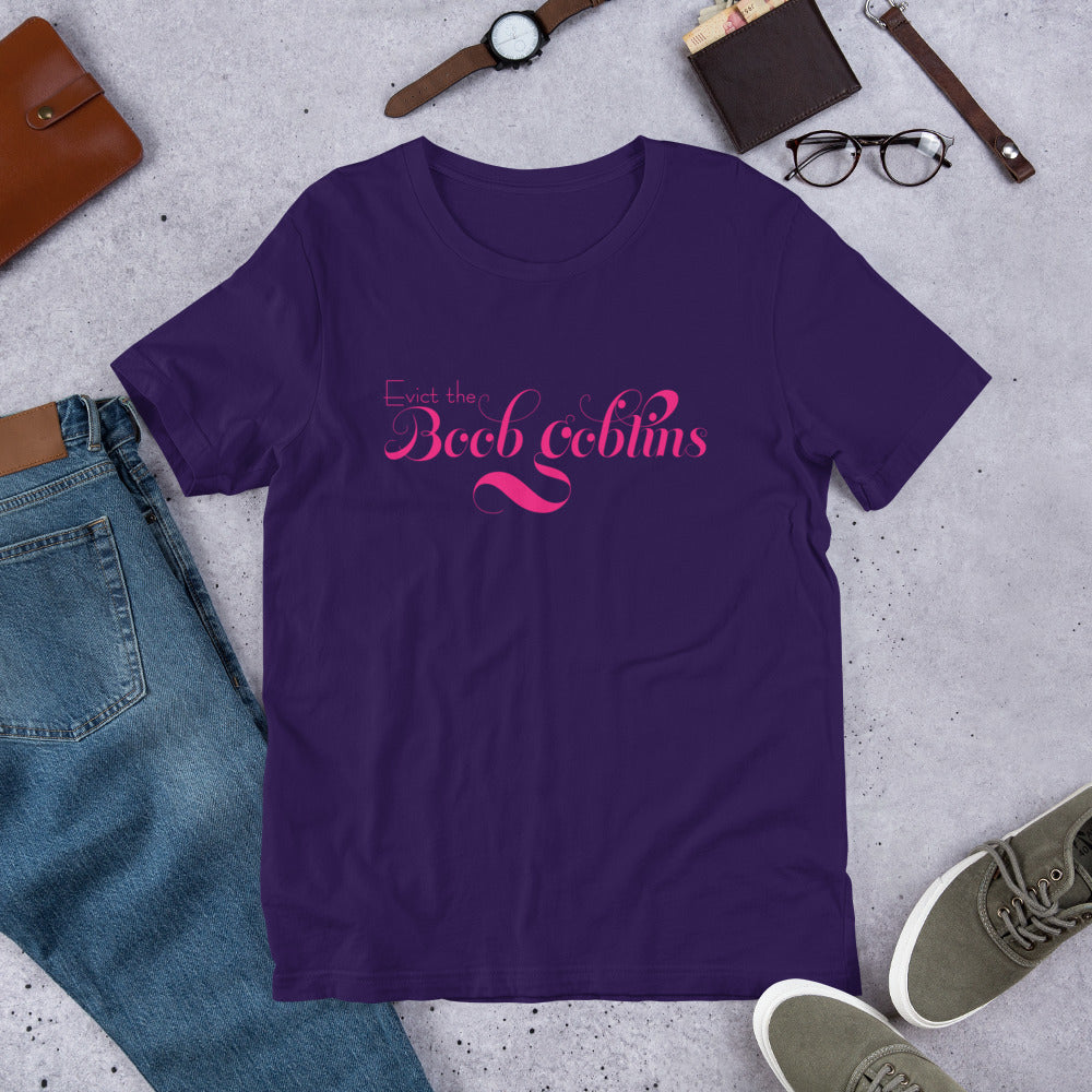 This one has made a few of the medical team snort. Wear this to see the radiologist... add some humor to the session. Bright Pink letters say "Evict the Boob Goblins".