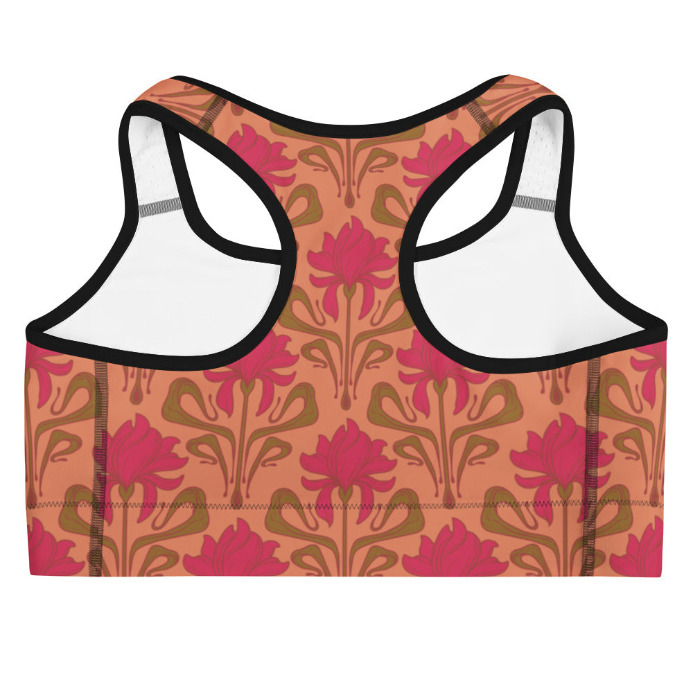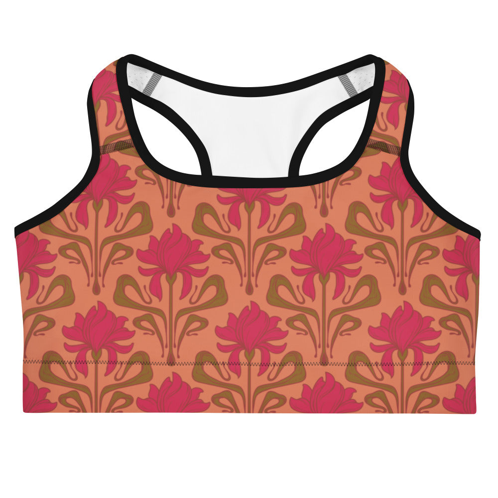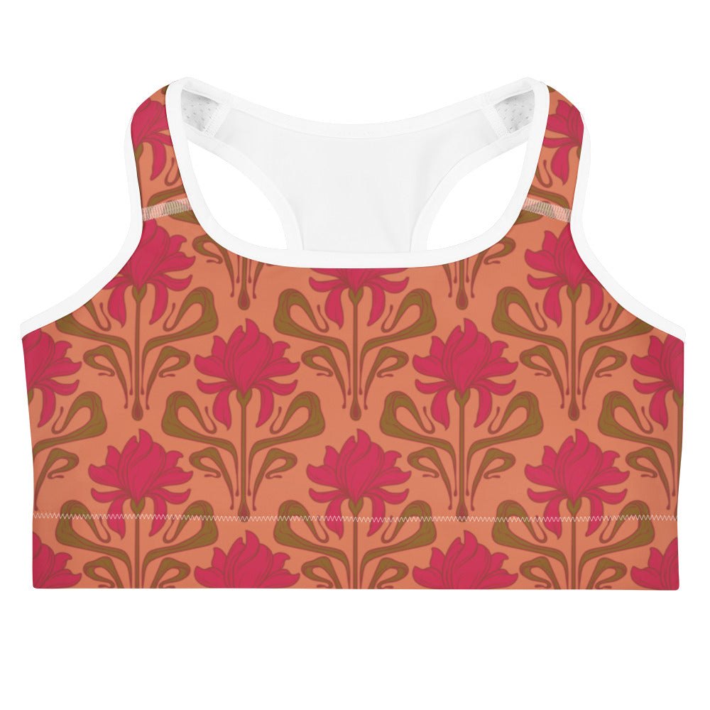 A beautiful Art Nouveau inspired iris print in poppy red with a melon colored background.