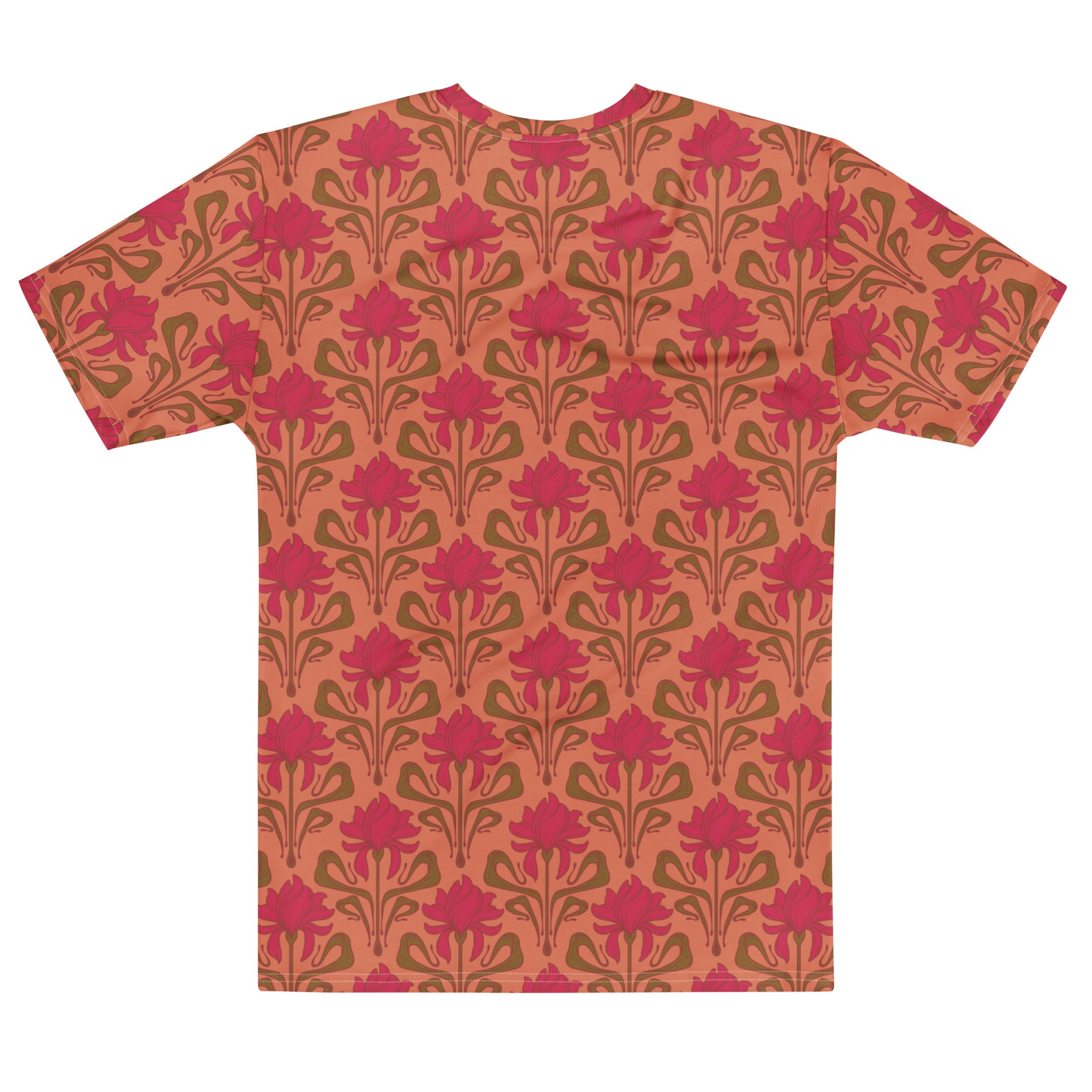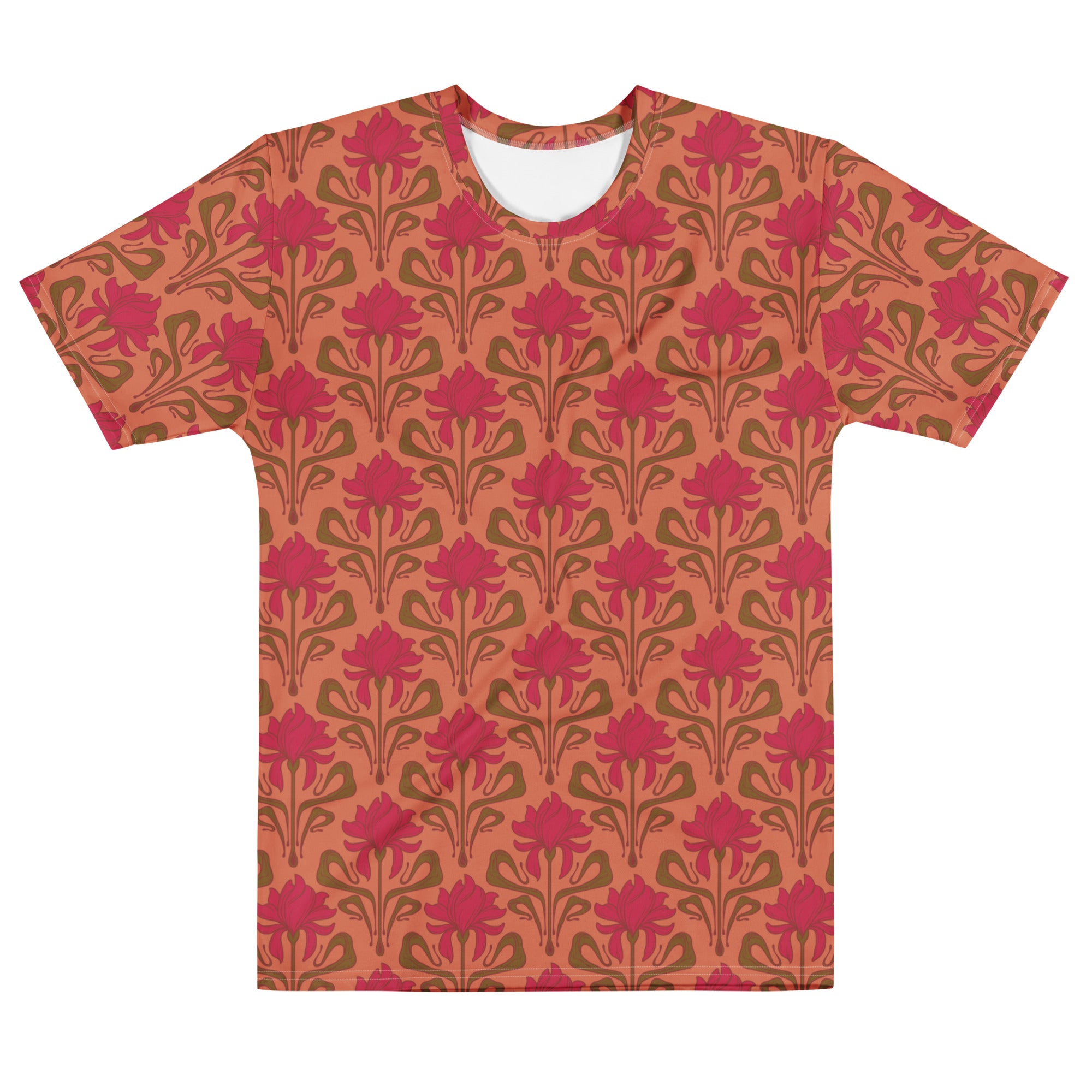 A beautiful Art Nouveau inspired iris print in poppy red with a melon colored background.