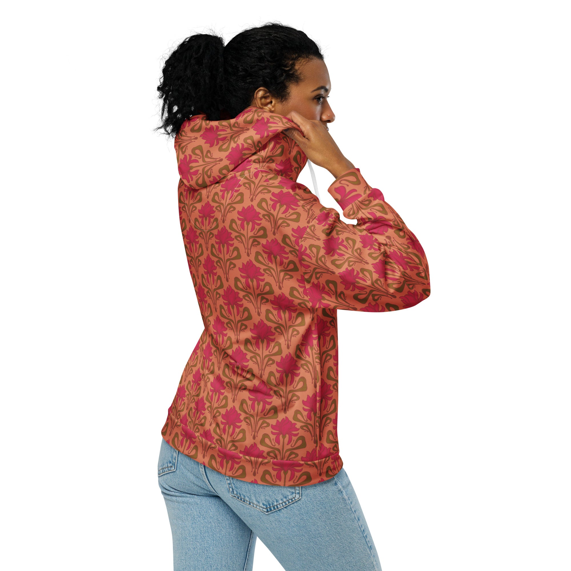 A beautiful Art Nouveau inspired iris print in poppy red with a melon colored background.