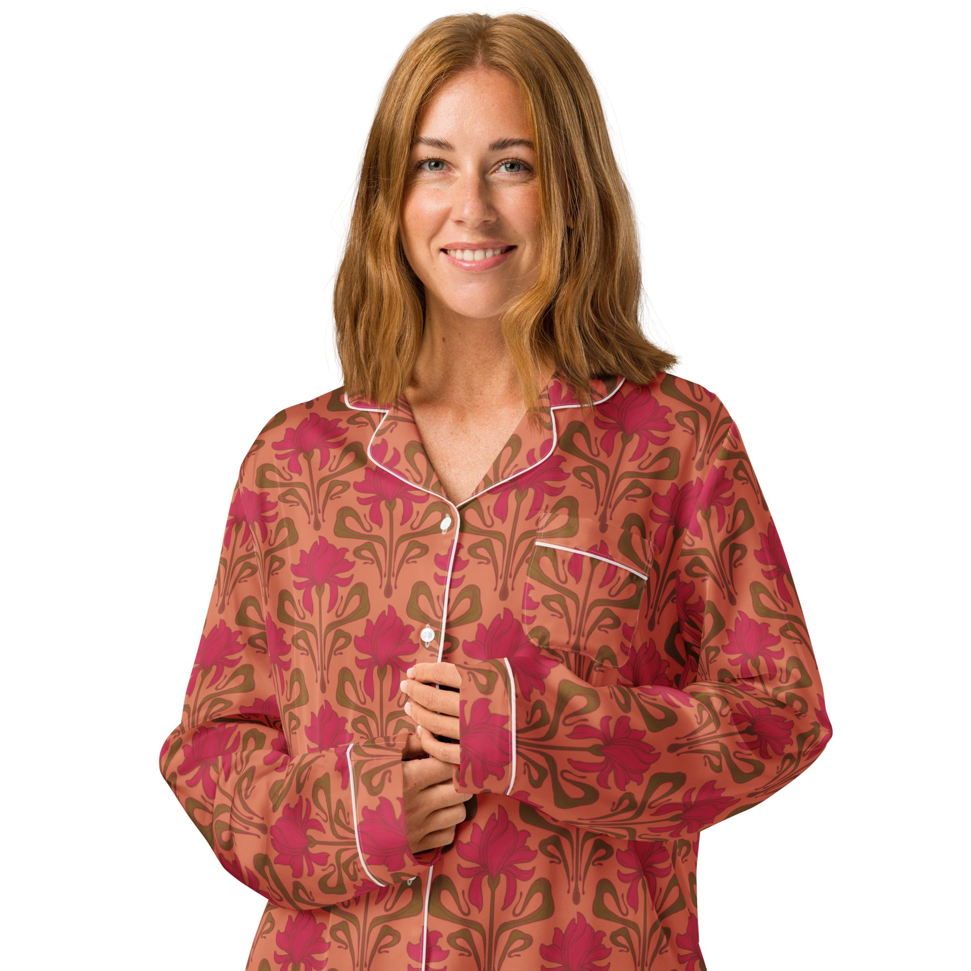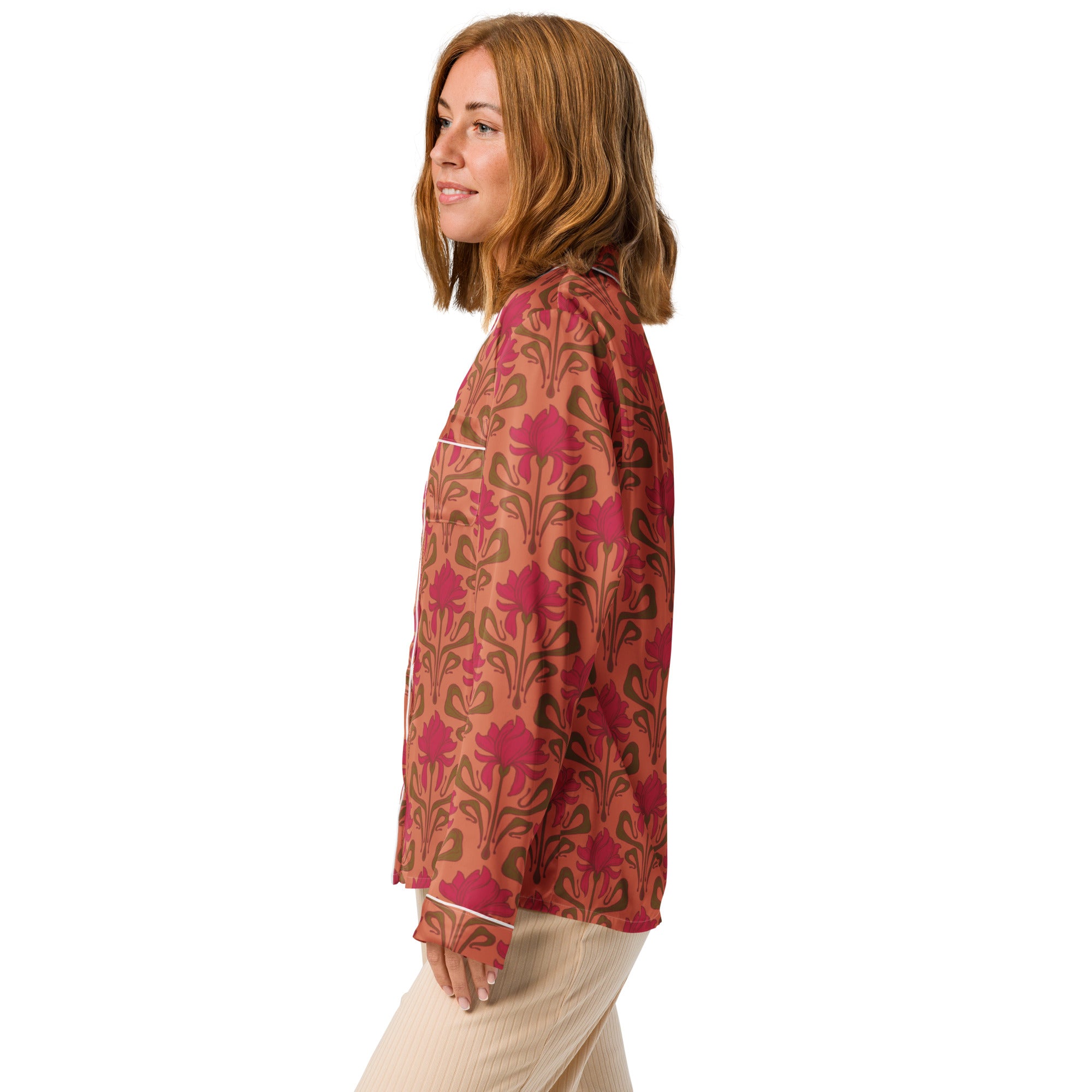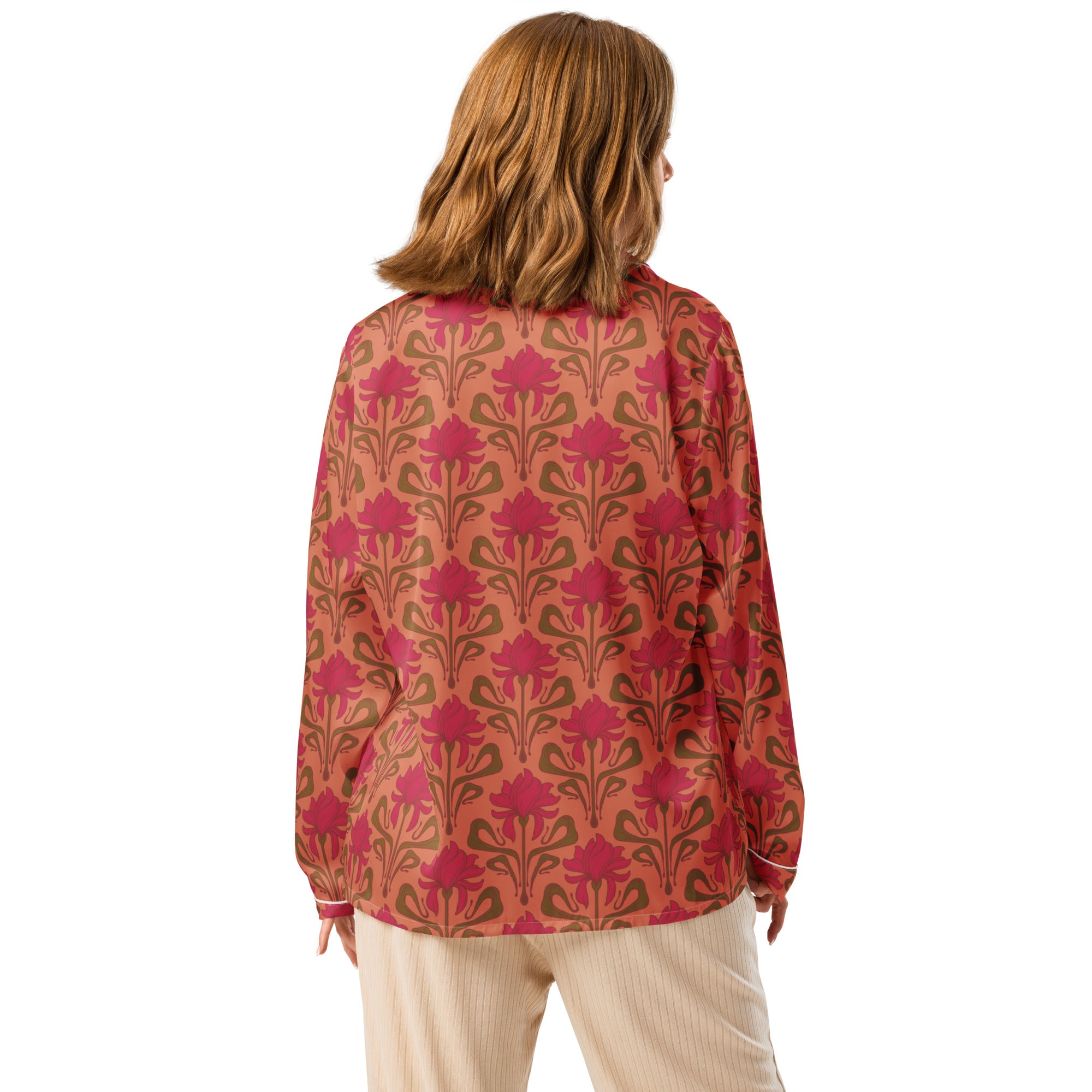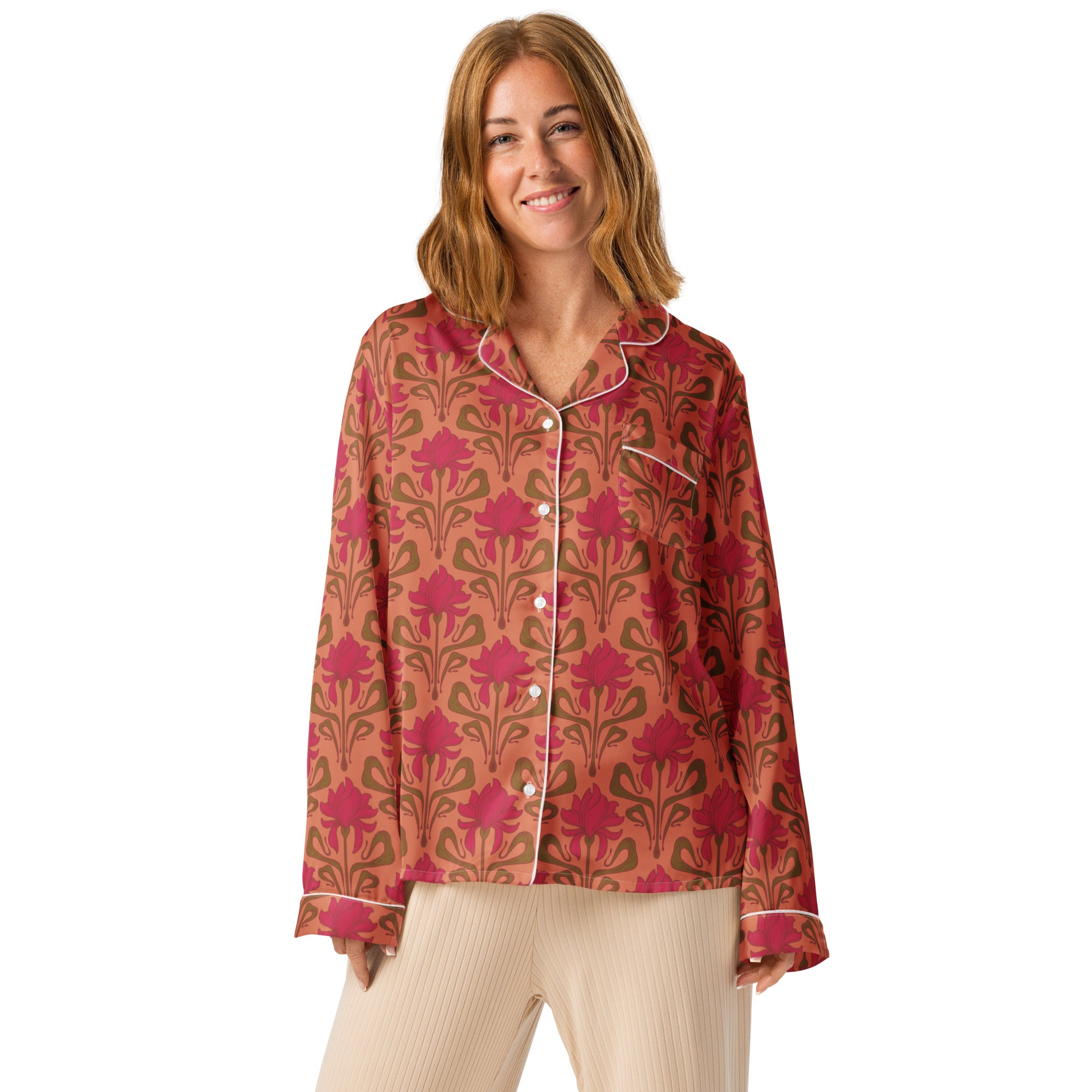 A beautiful Art Nouveau inspired iris print in poppy red with a melon colored background.