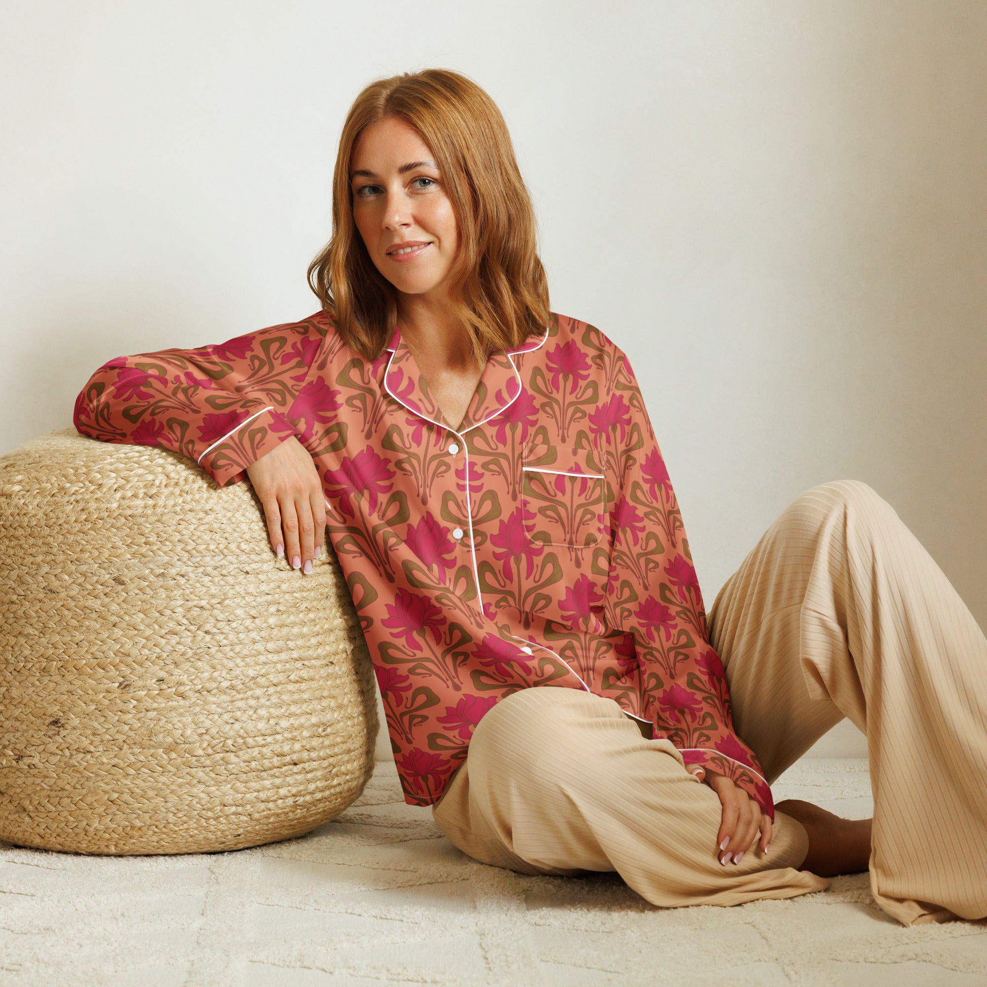This silky pajama top is ideal for a cozy day when you want to feel both comfortable and elegant. It features a relaxed fit, chest pocket, and elegant piping detail.