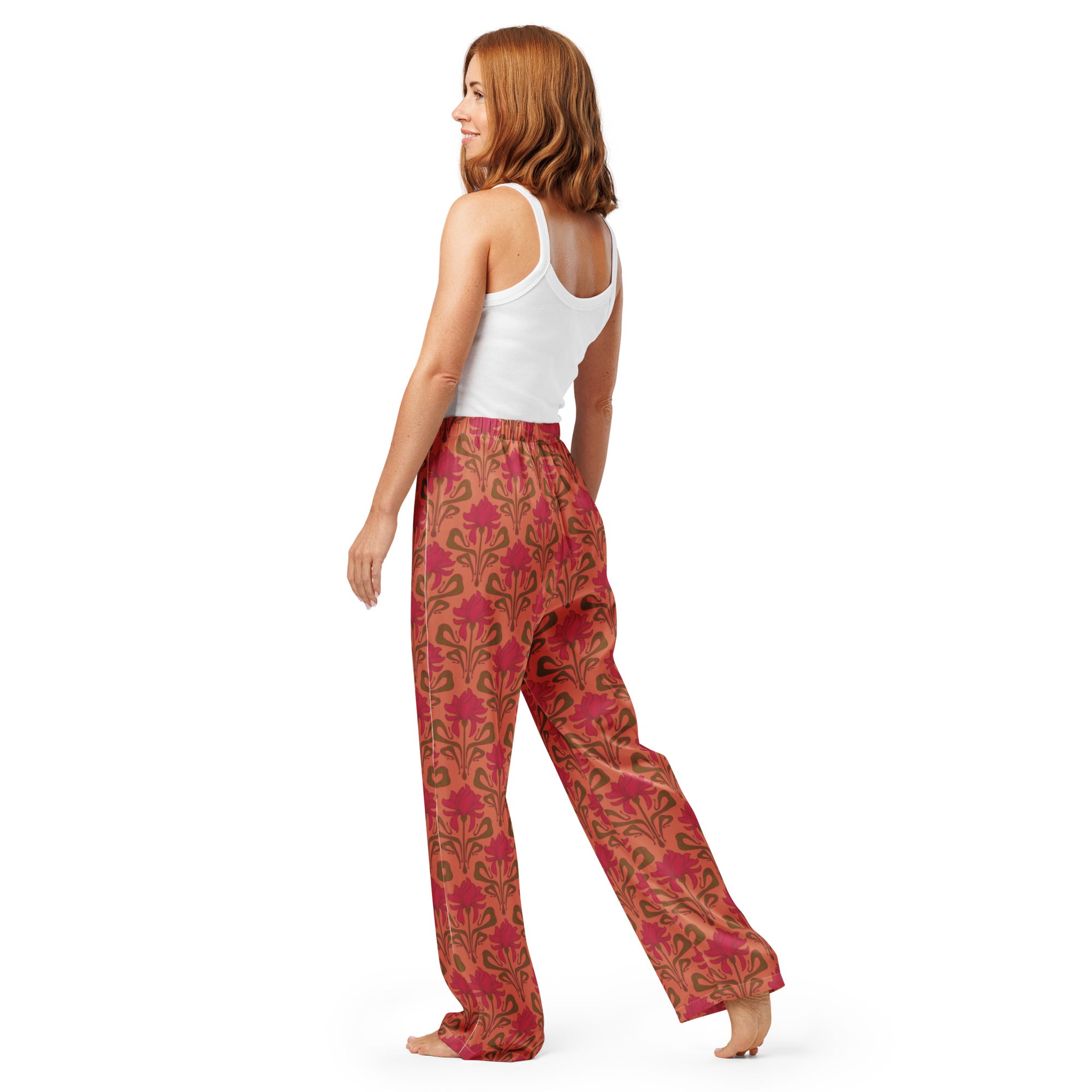 A beautiful Art Nouveau inspired iris print in poppy red with a melon colored background.