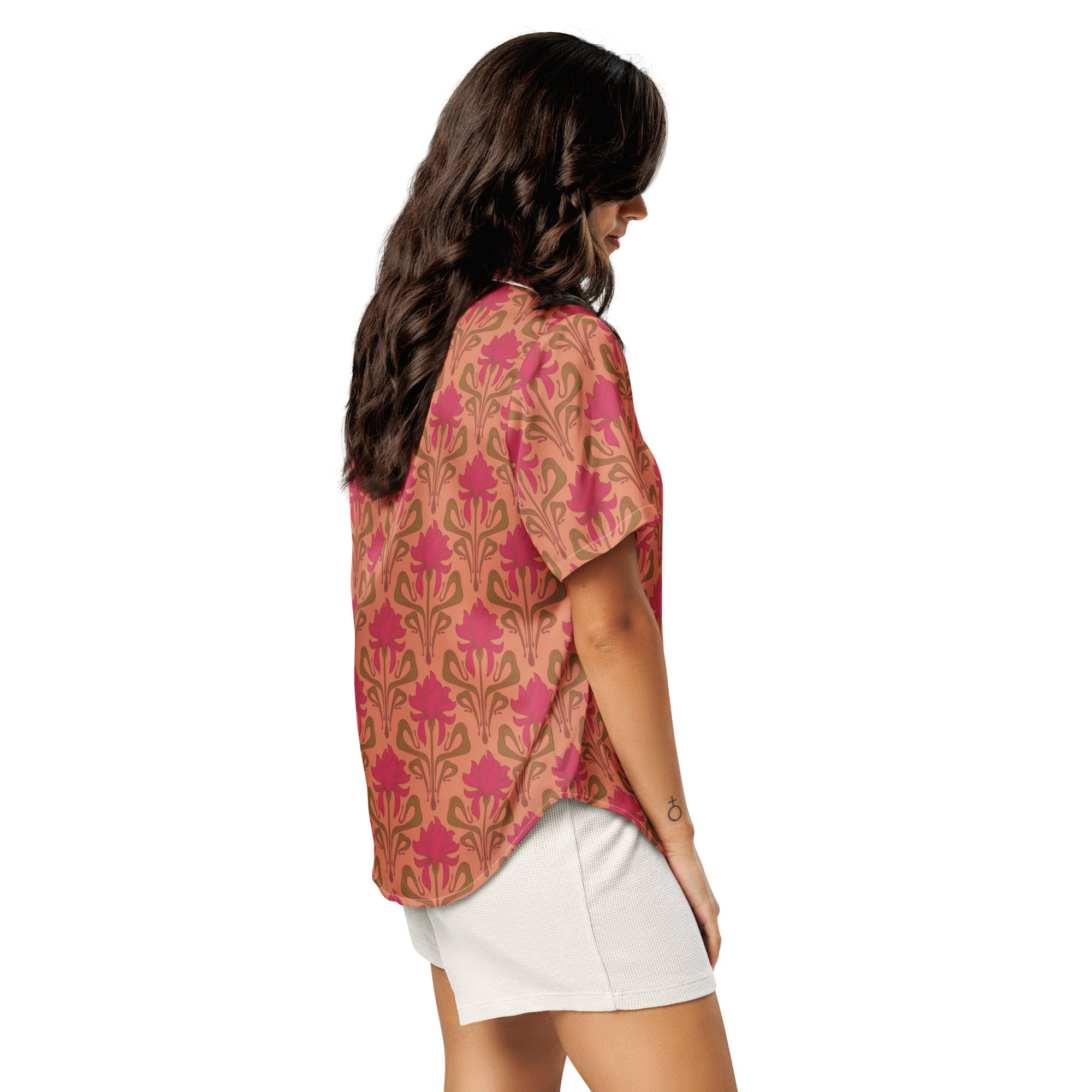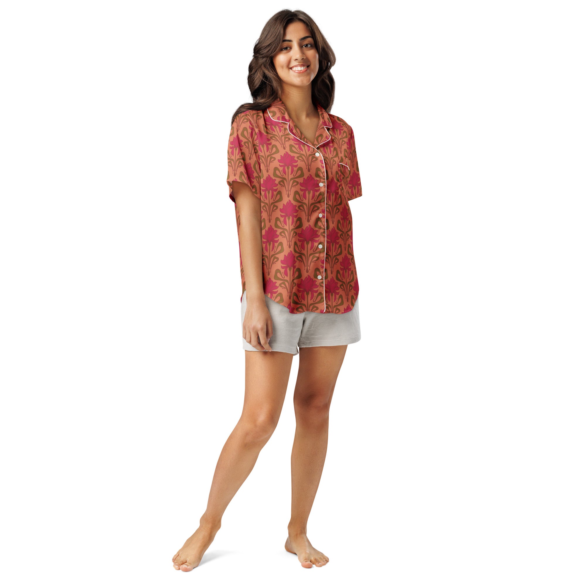 A beautiful Art Nouveau inspired iris print in poppy red with a melon colored background.