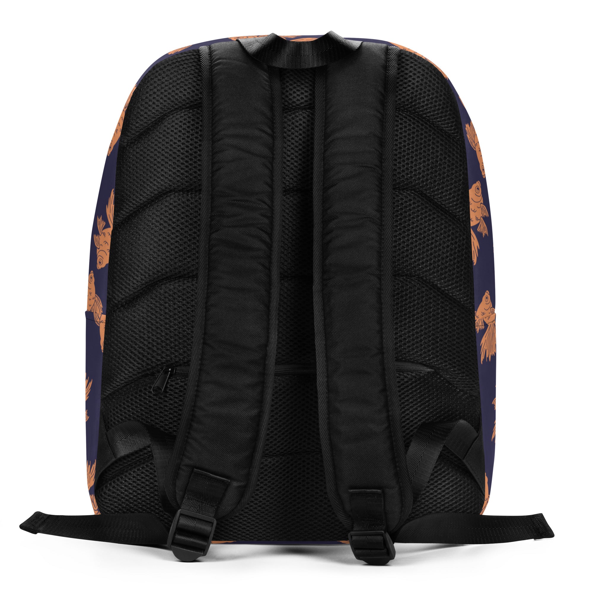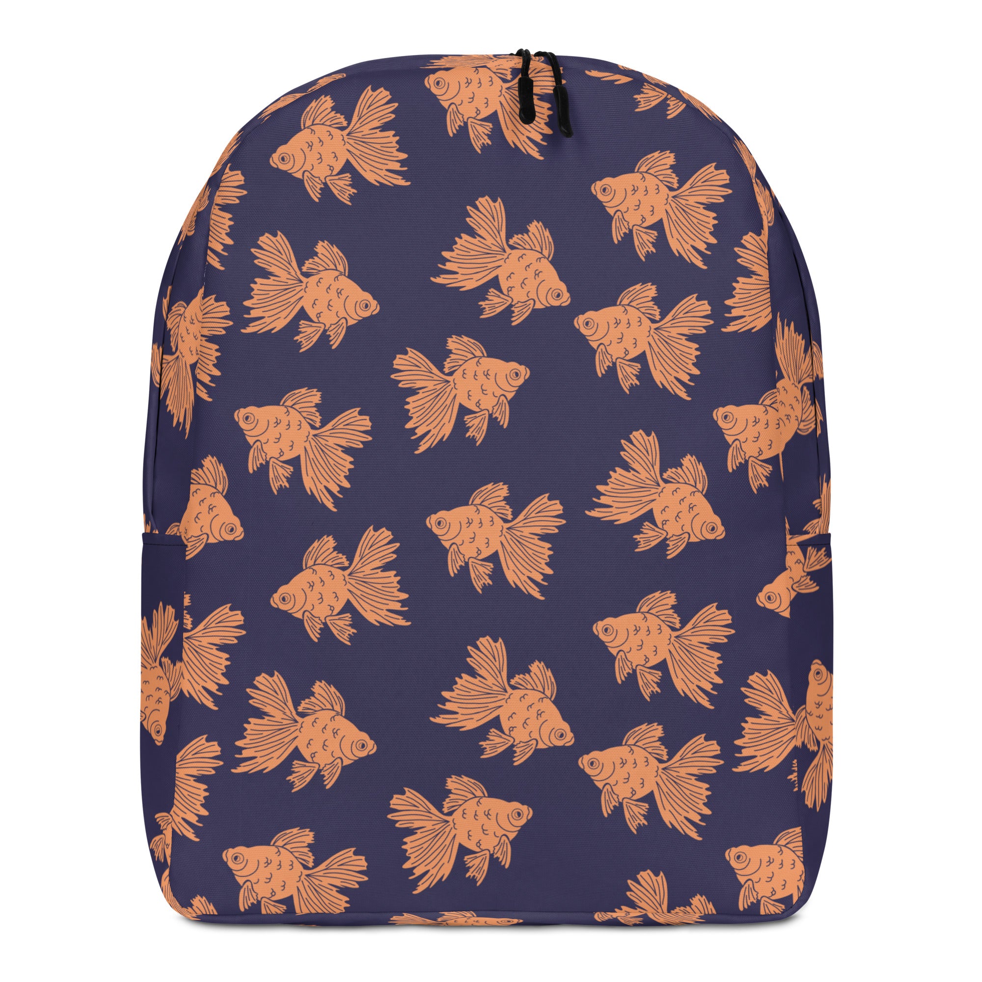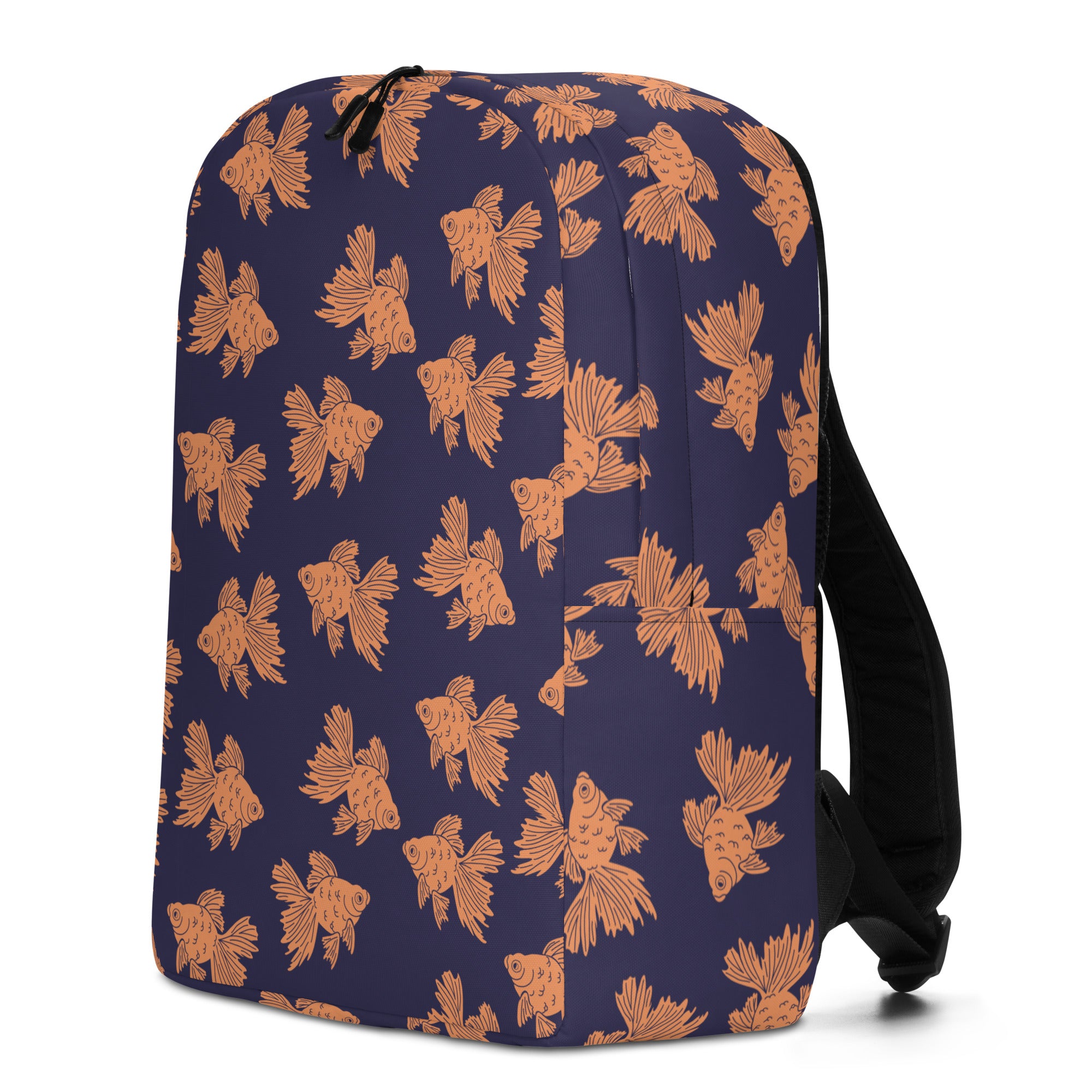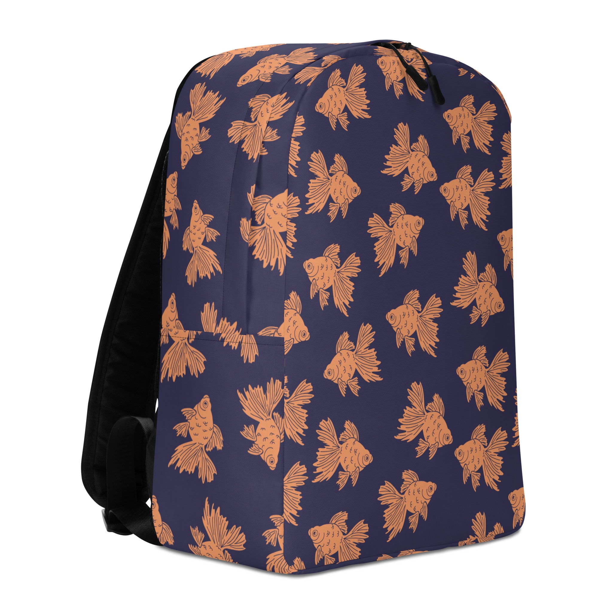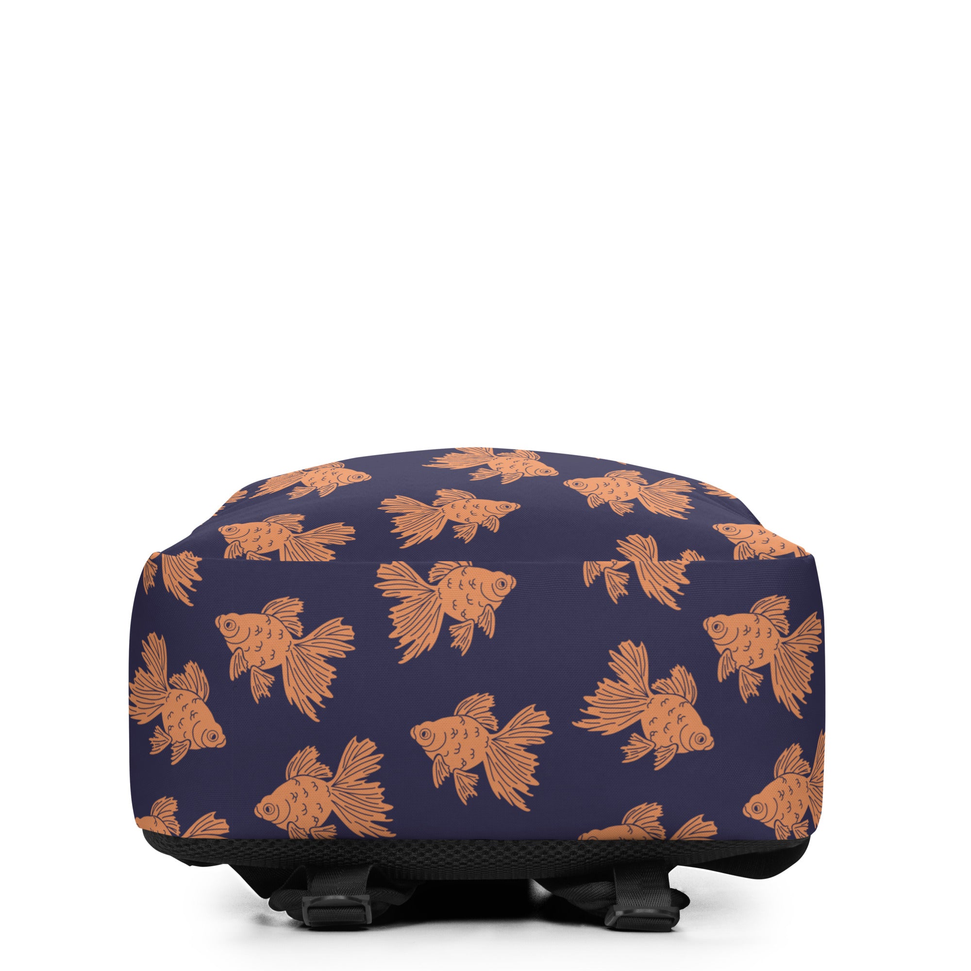 Some fancy orange goldfish swimming along on a navy background.