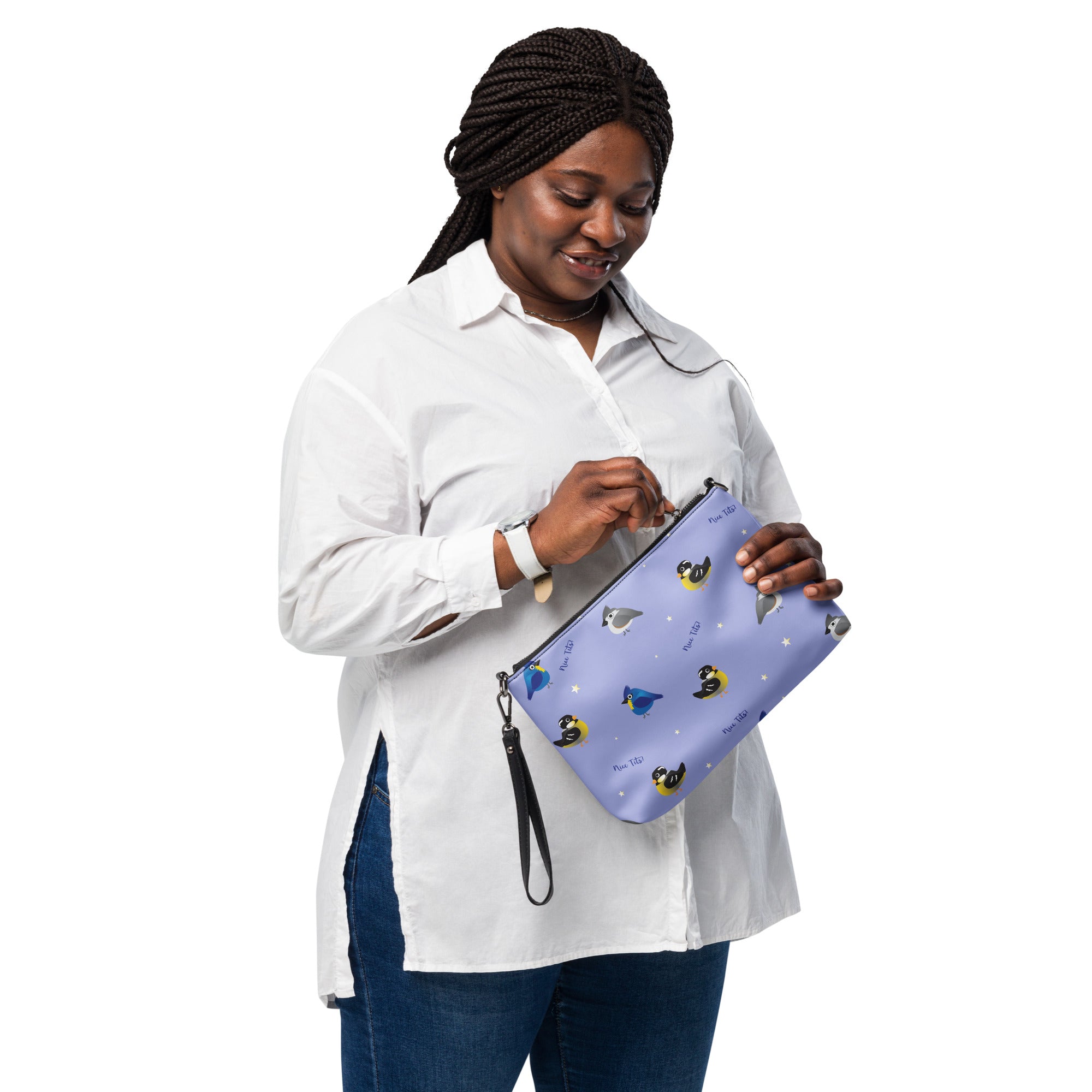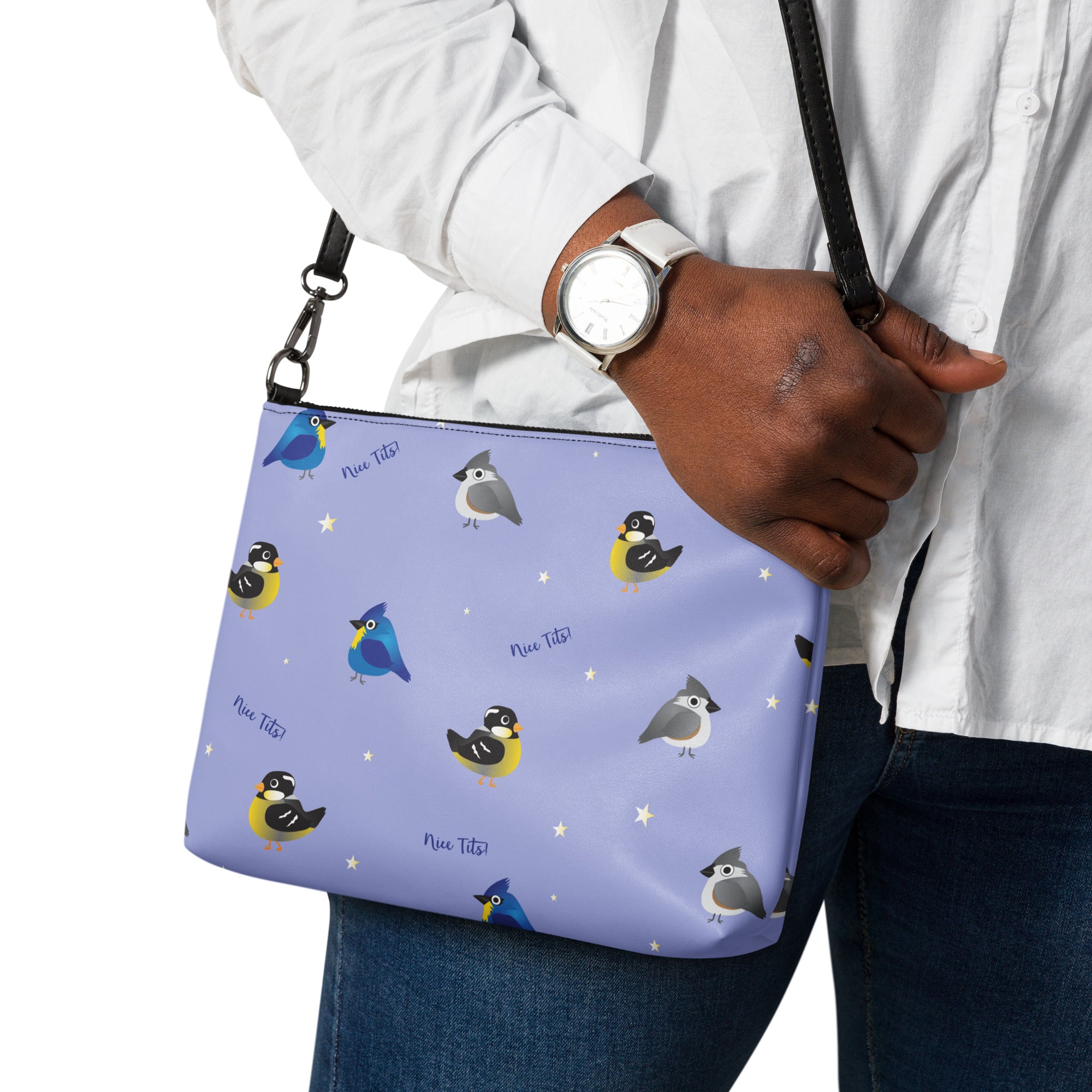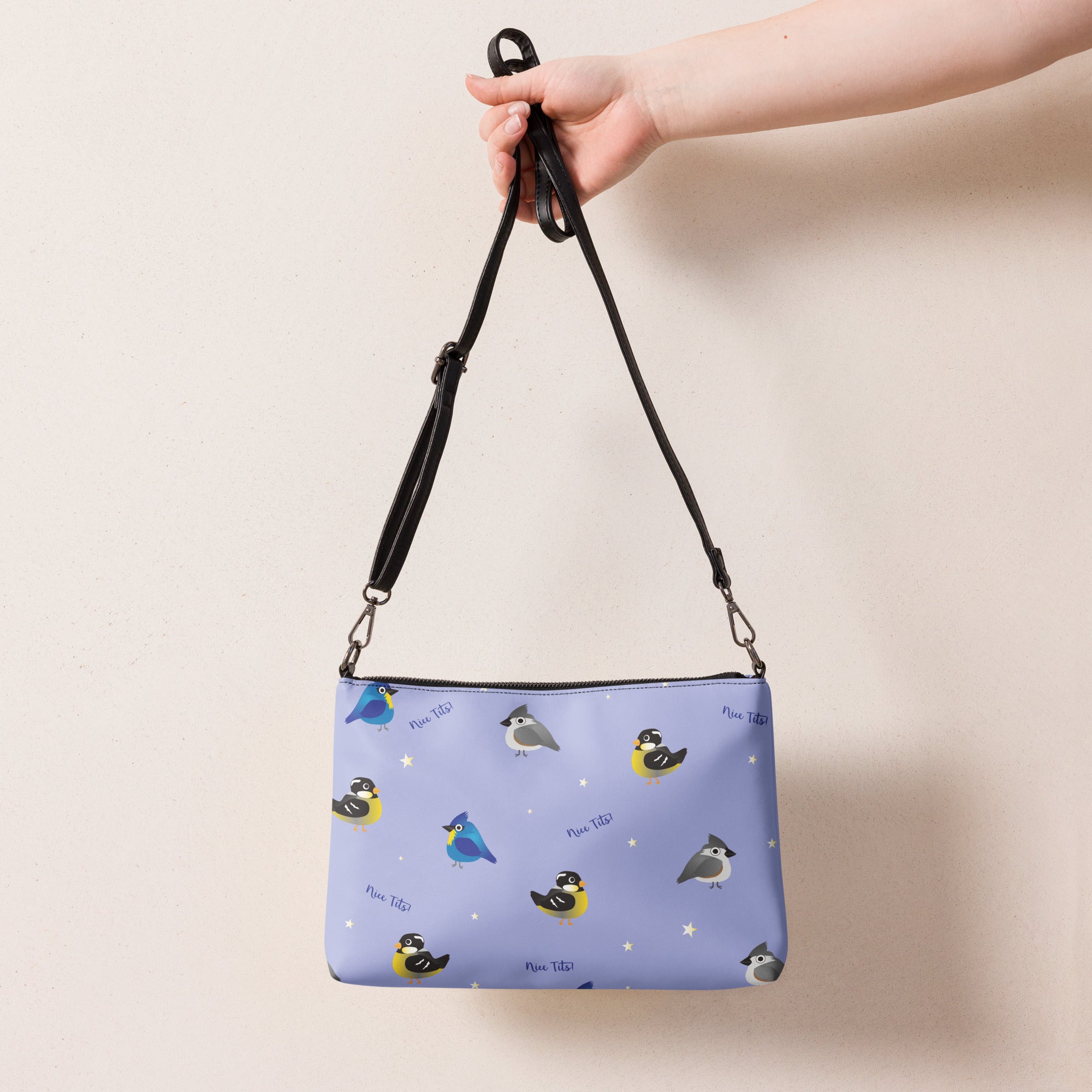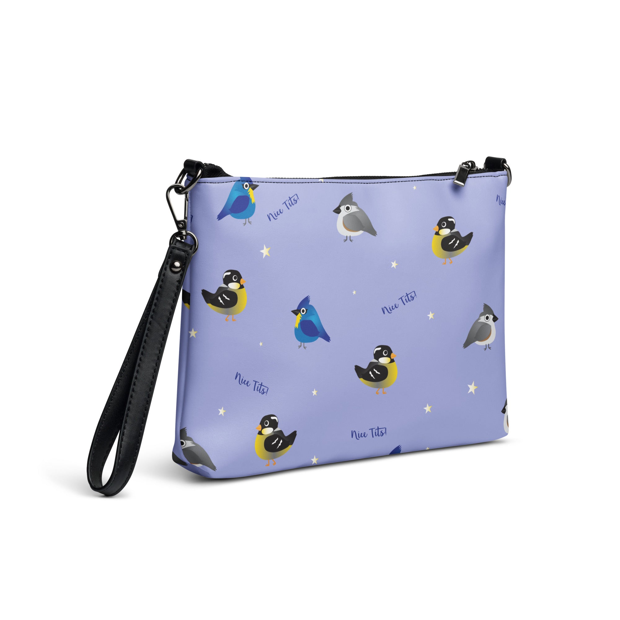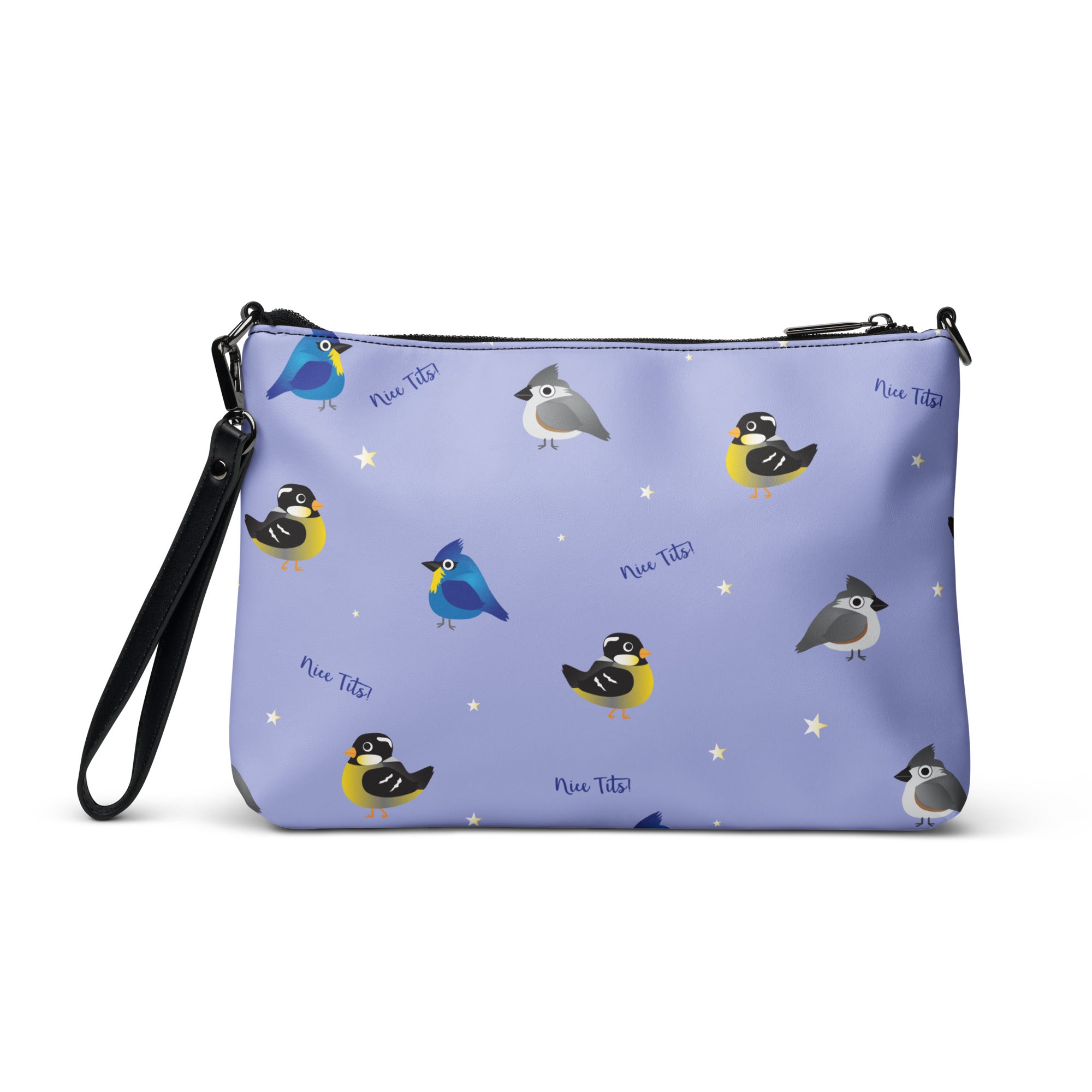 Who doesn't enjoys seeing and adorable tit(mouse) out on the feeder or hopping along the fence. Bet you just had a real funny visual.... This print features a variety of fat birds on a periwinkle colored background, with stars and the words 'nice tits' scattered around.