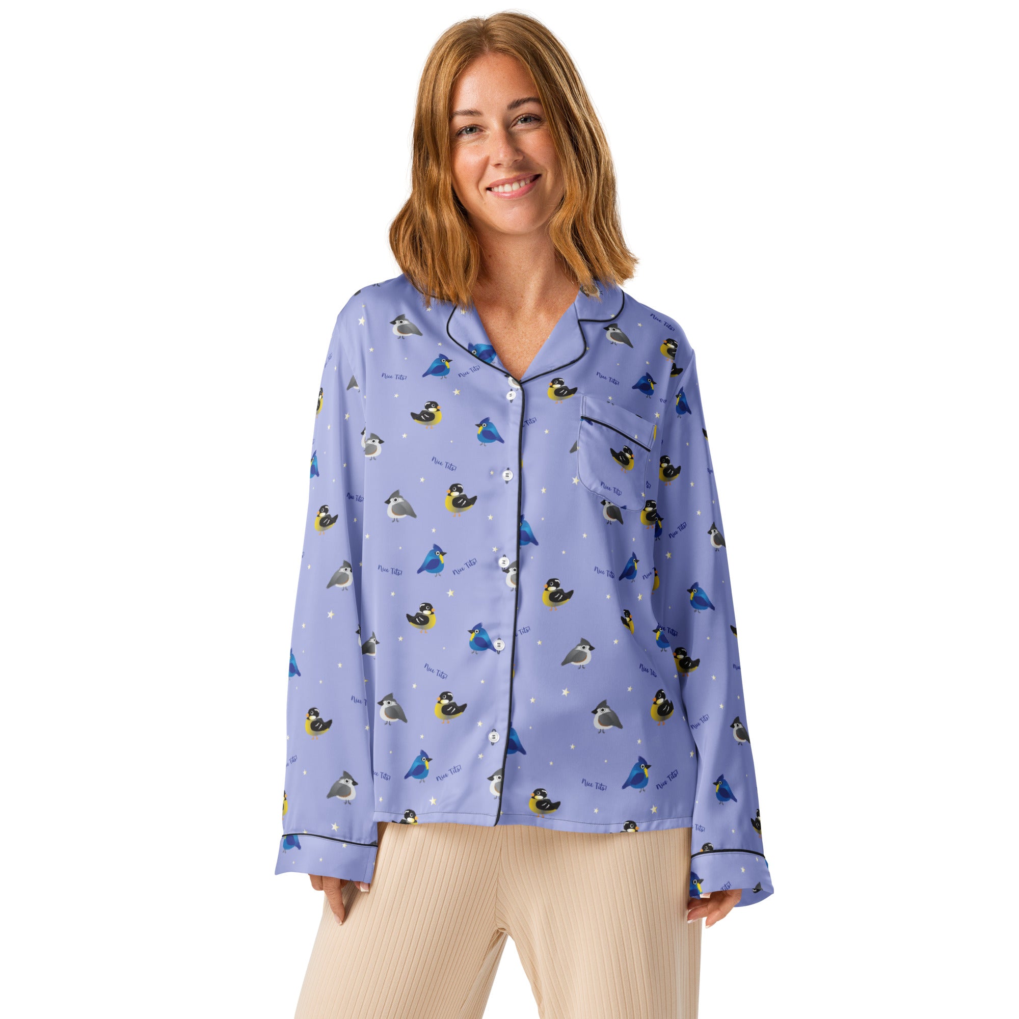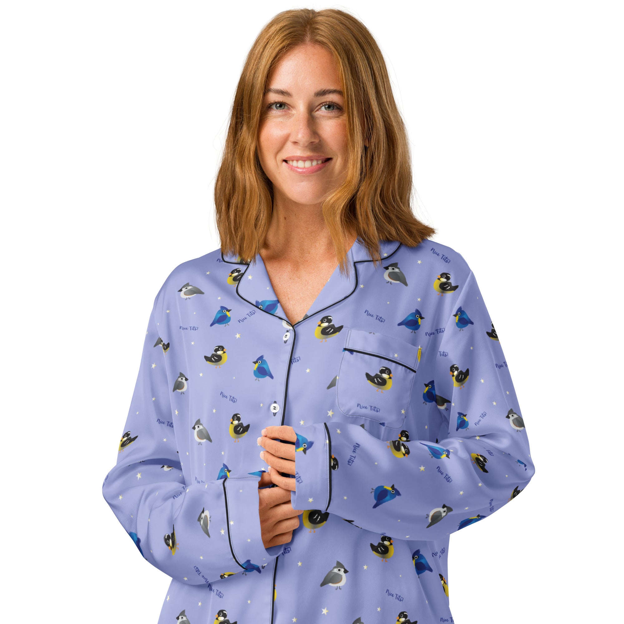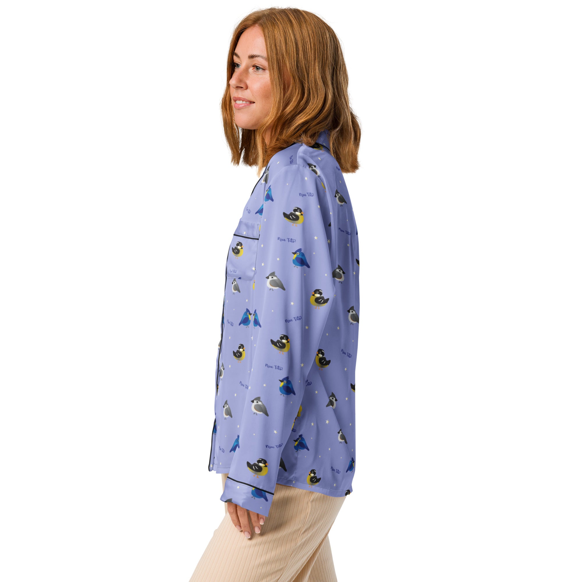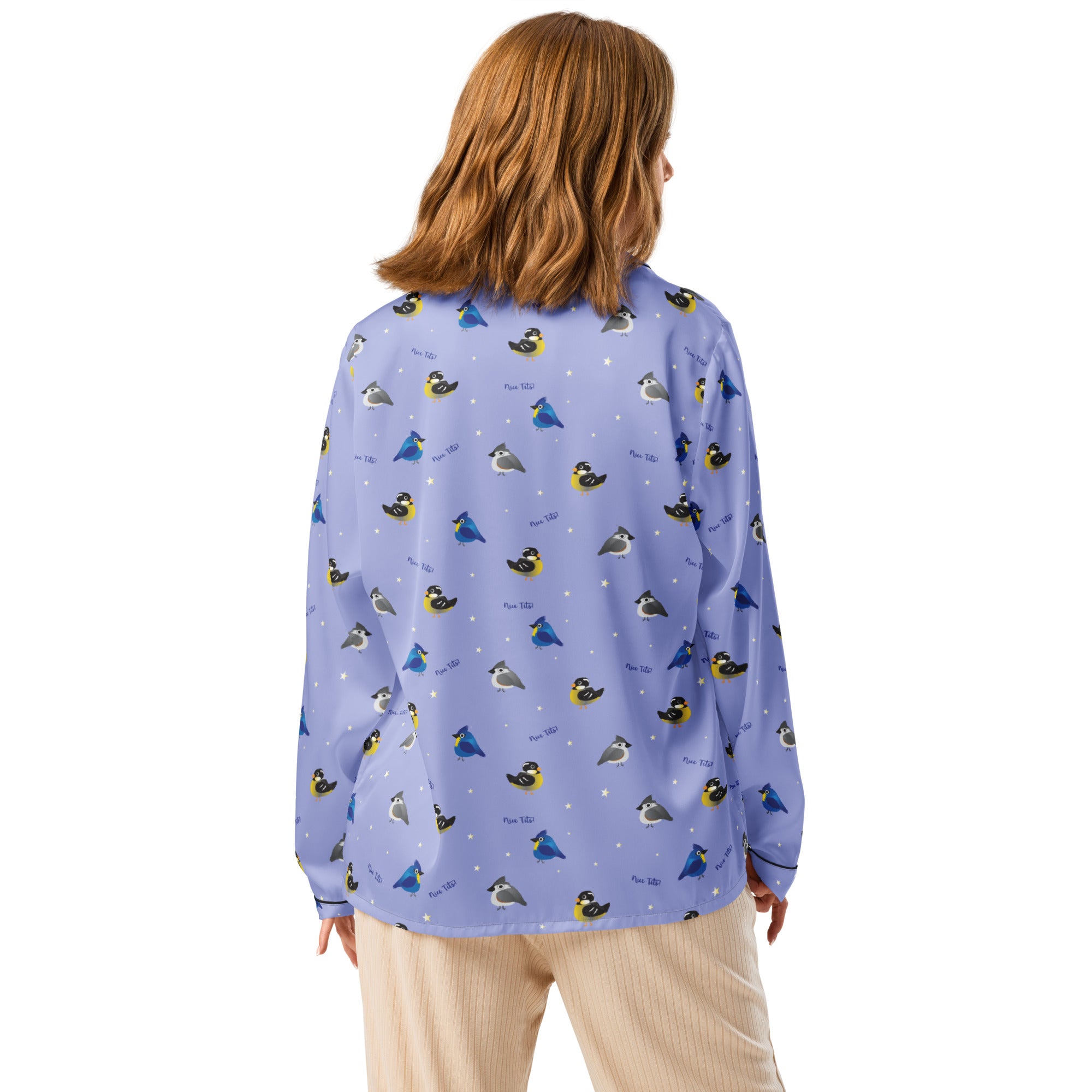 Who doesn't enjoys seeing and adorable tit(mouse) out on the feeder or hopping along the fence. Bet you just had a real funny visual.... This print features a variety of fat birds on a periwinkle colored background, with stars and the words 'nice tits' scattered around.