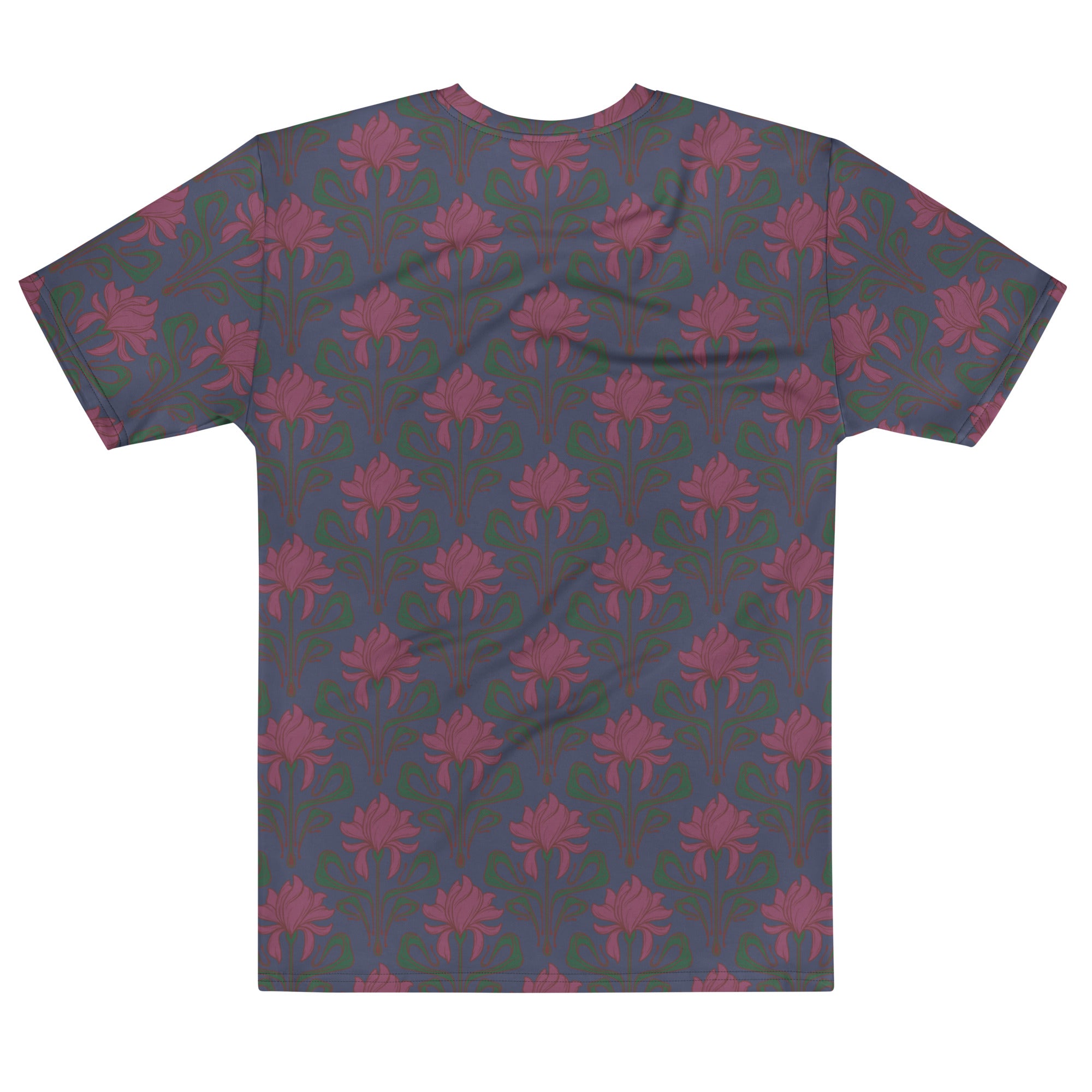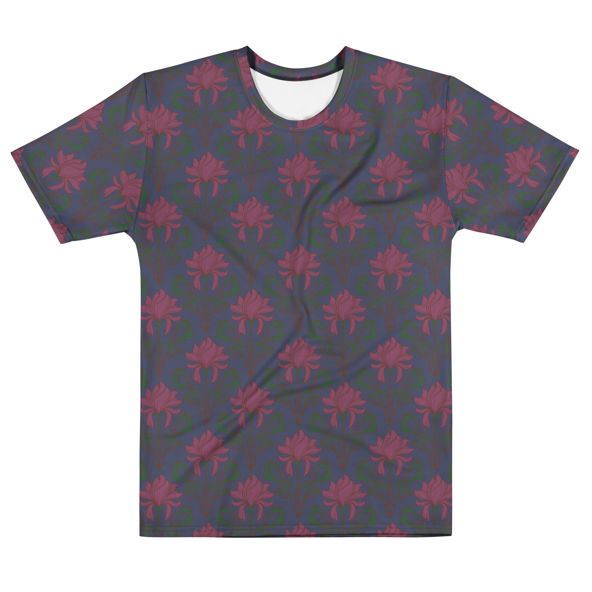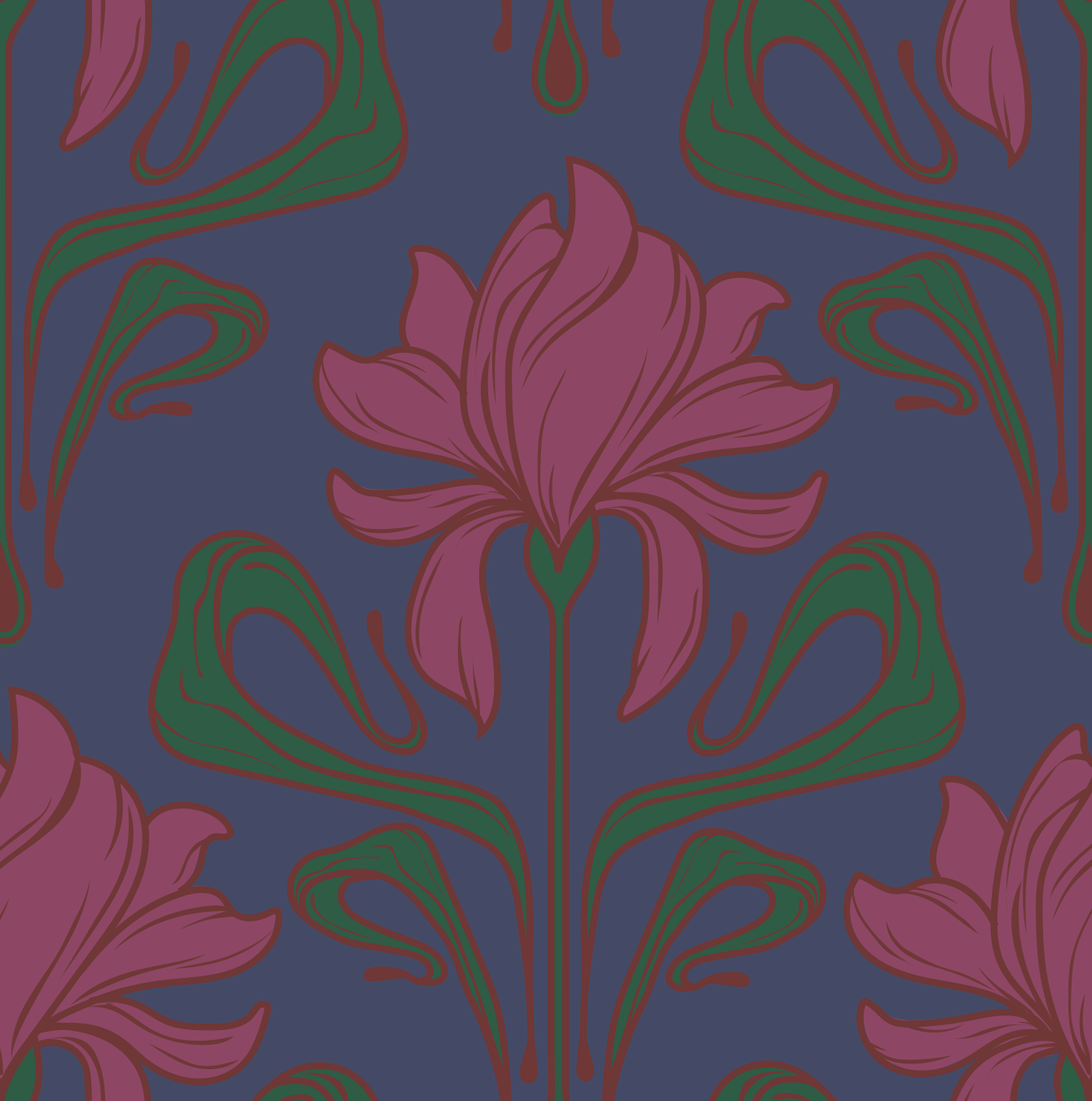 A beautiful Art Nouveau inspired iris print in wine with a crown blue colored background.