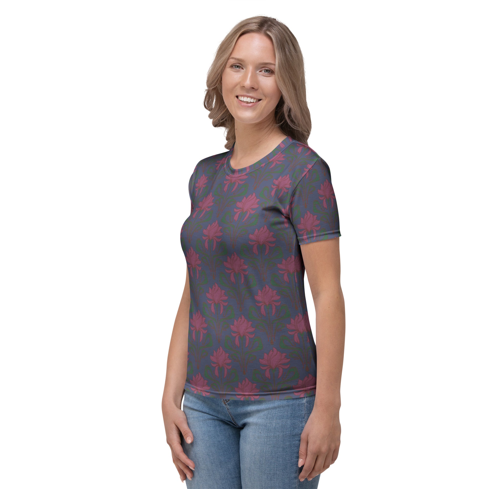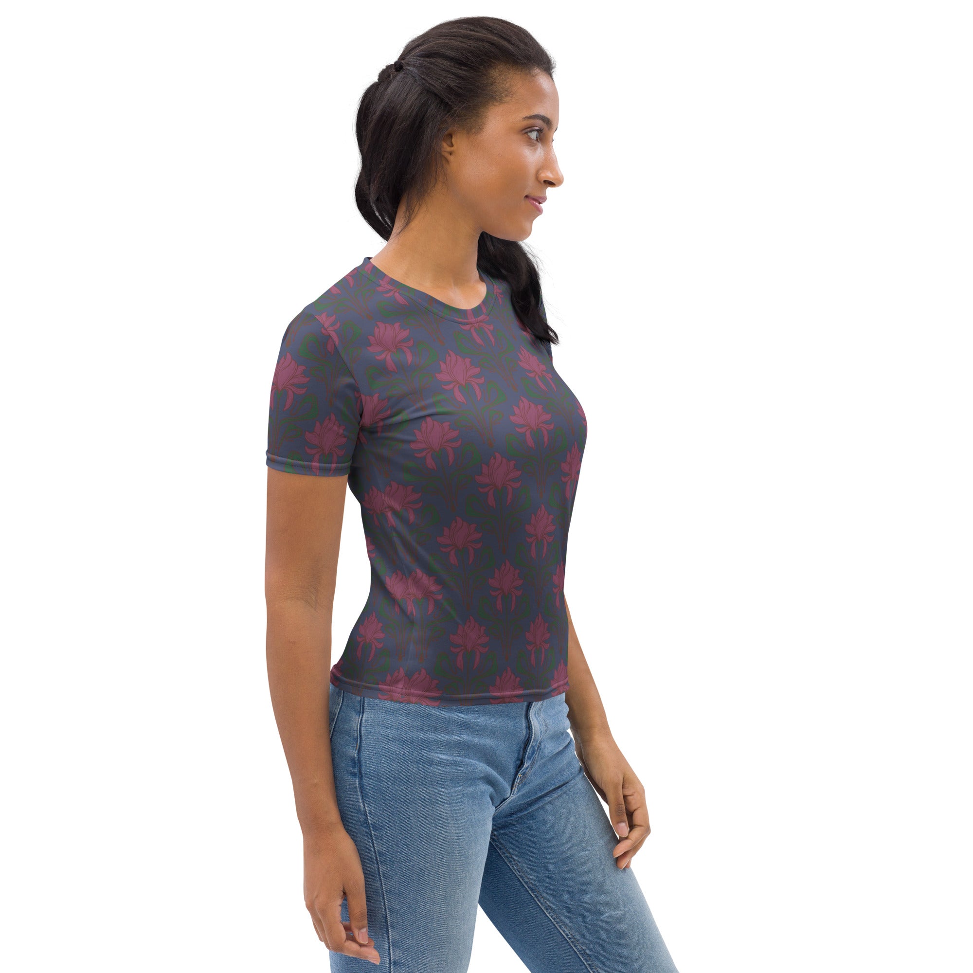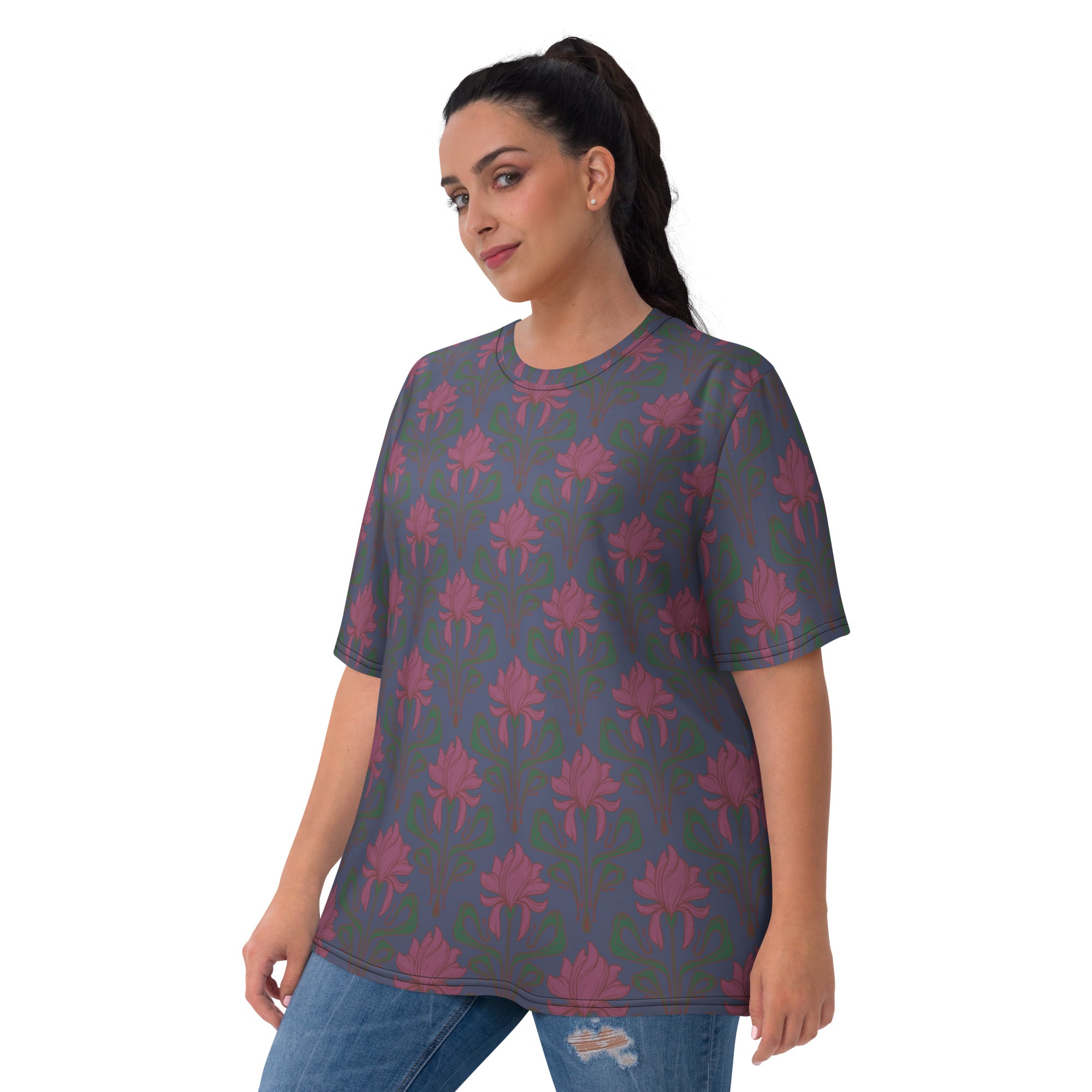 A beautiful Art Nouveau inspired iris print in wine with a crown blue colored background.