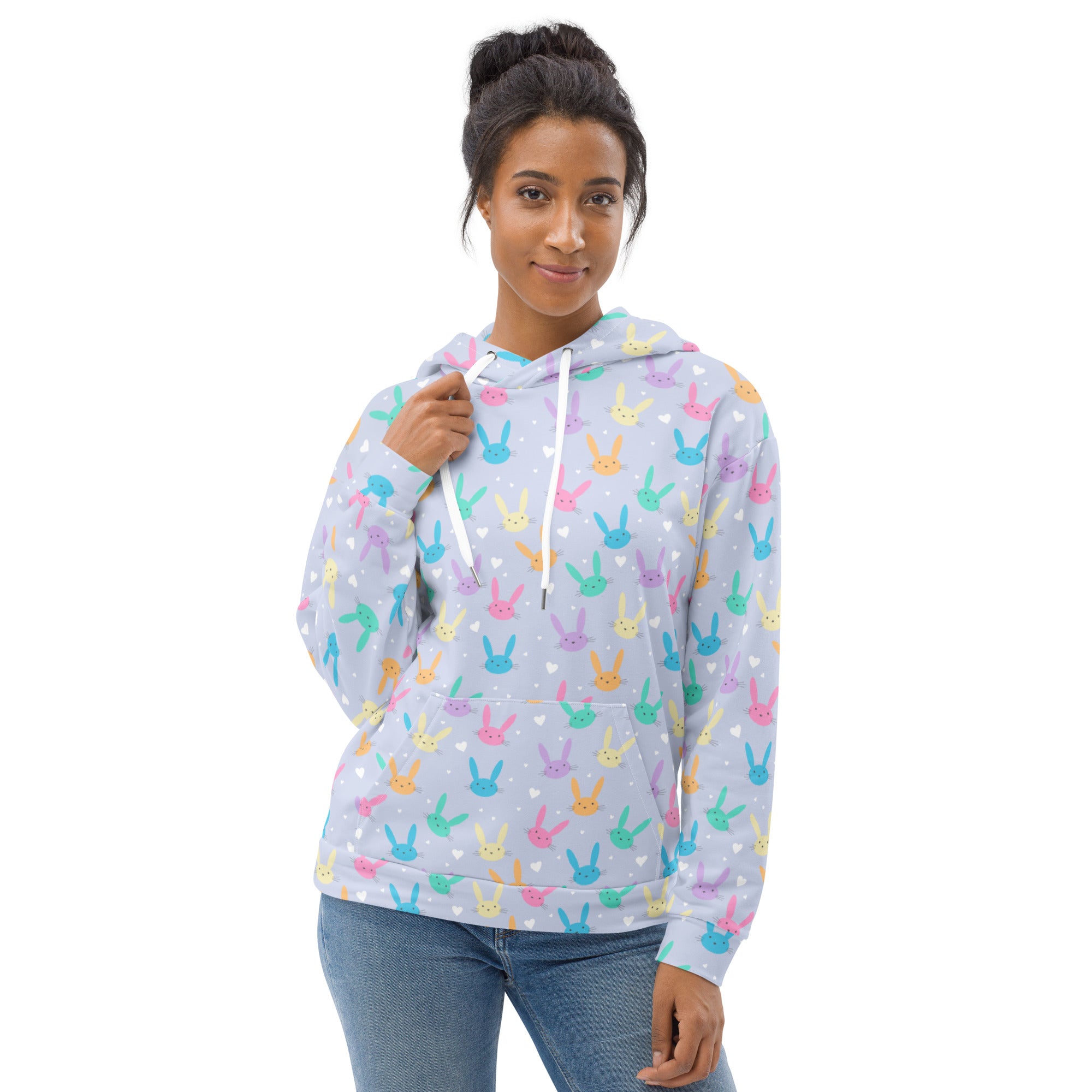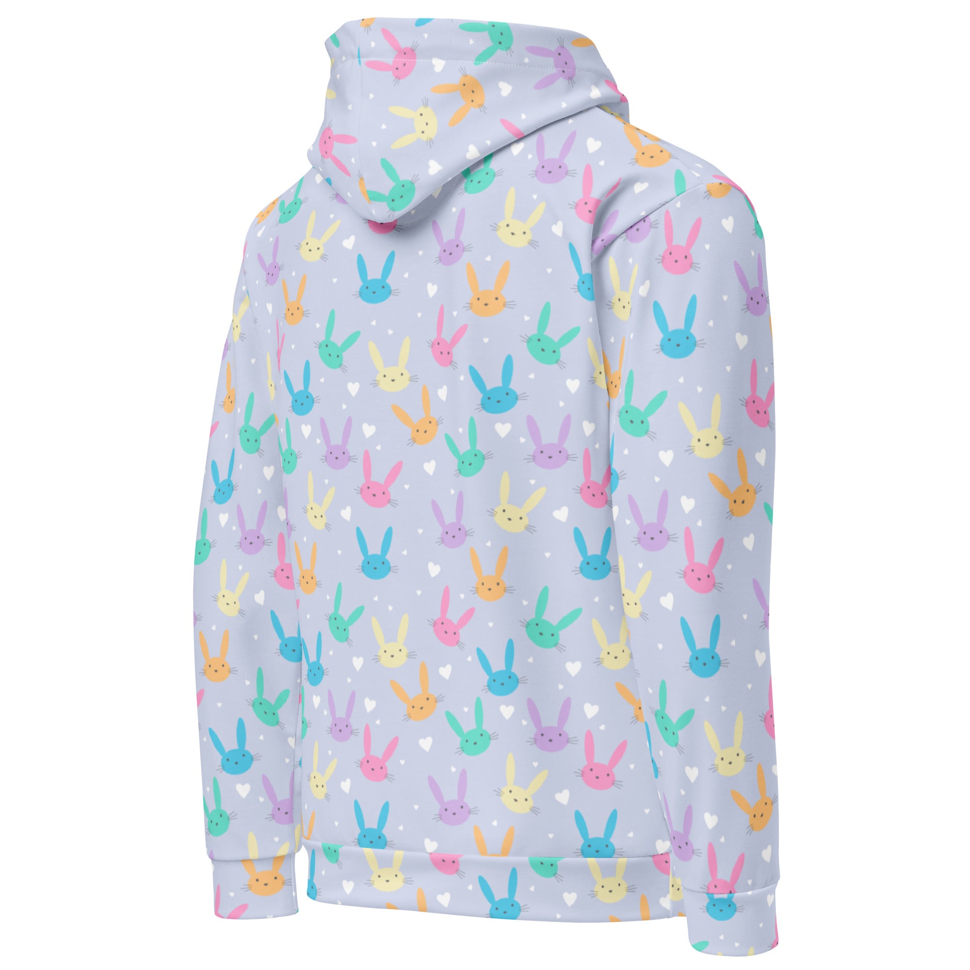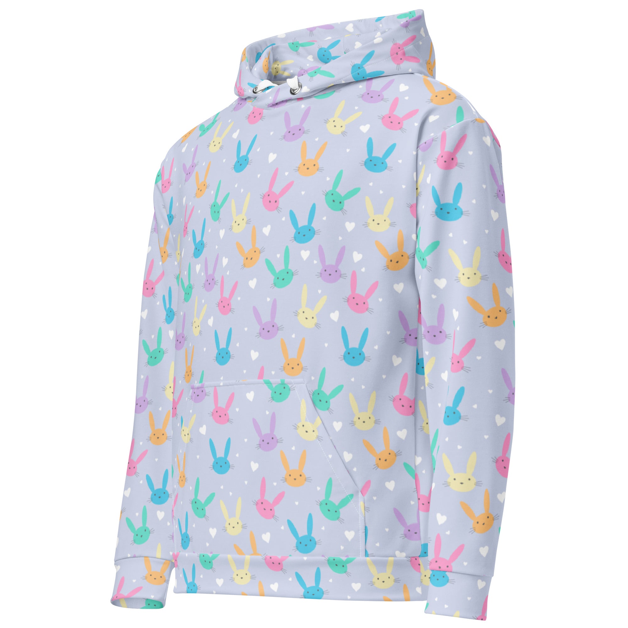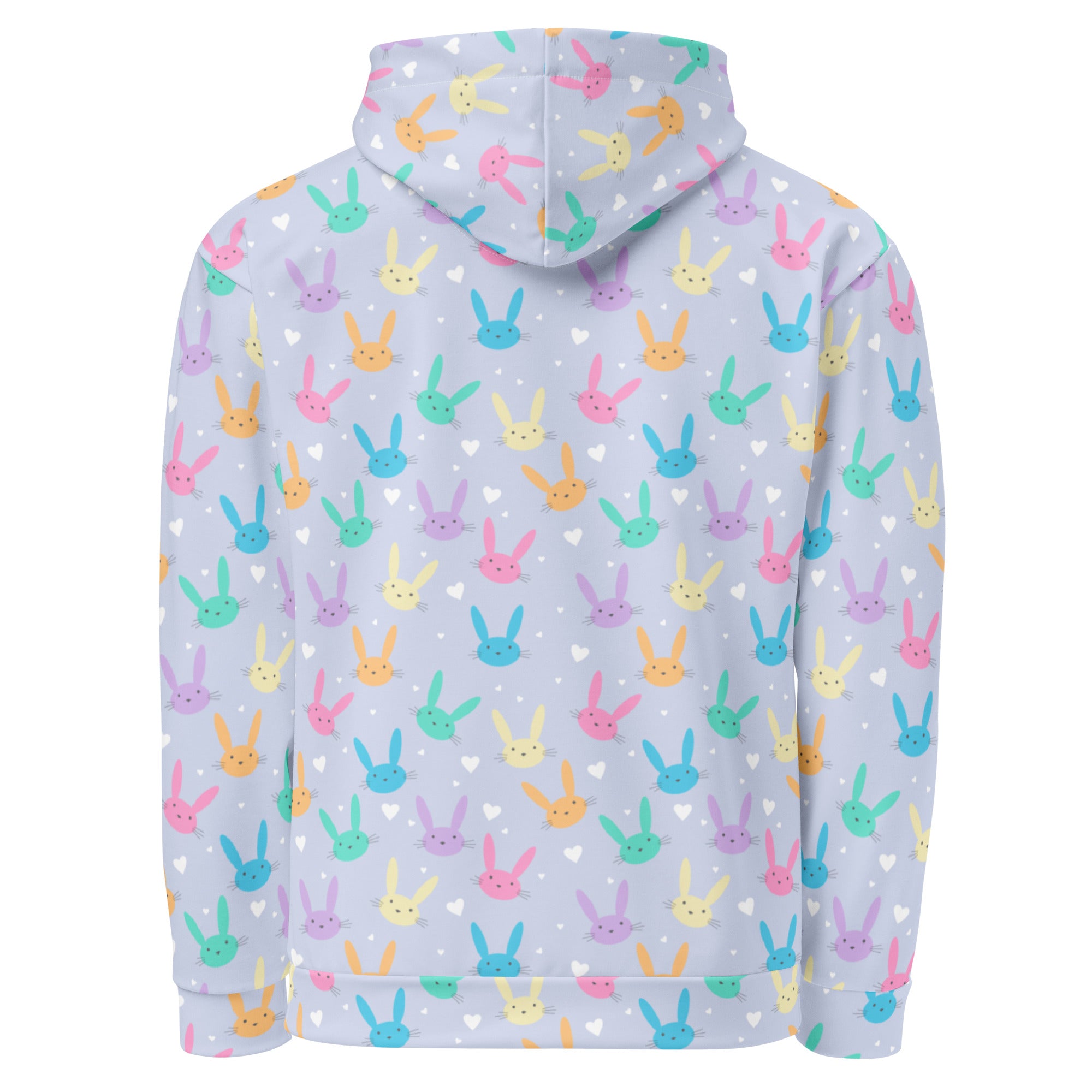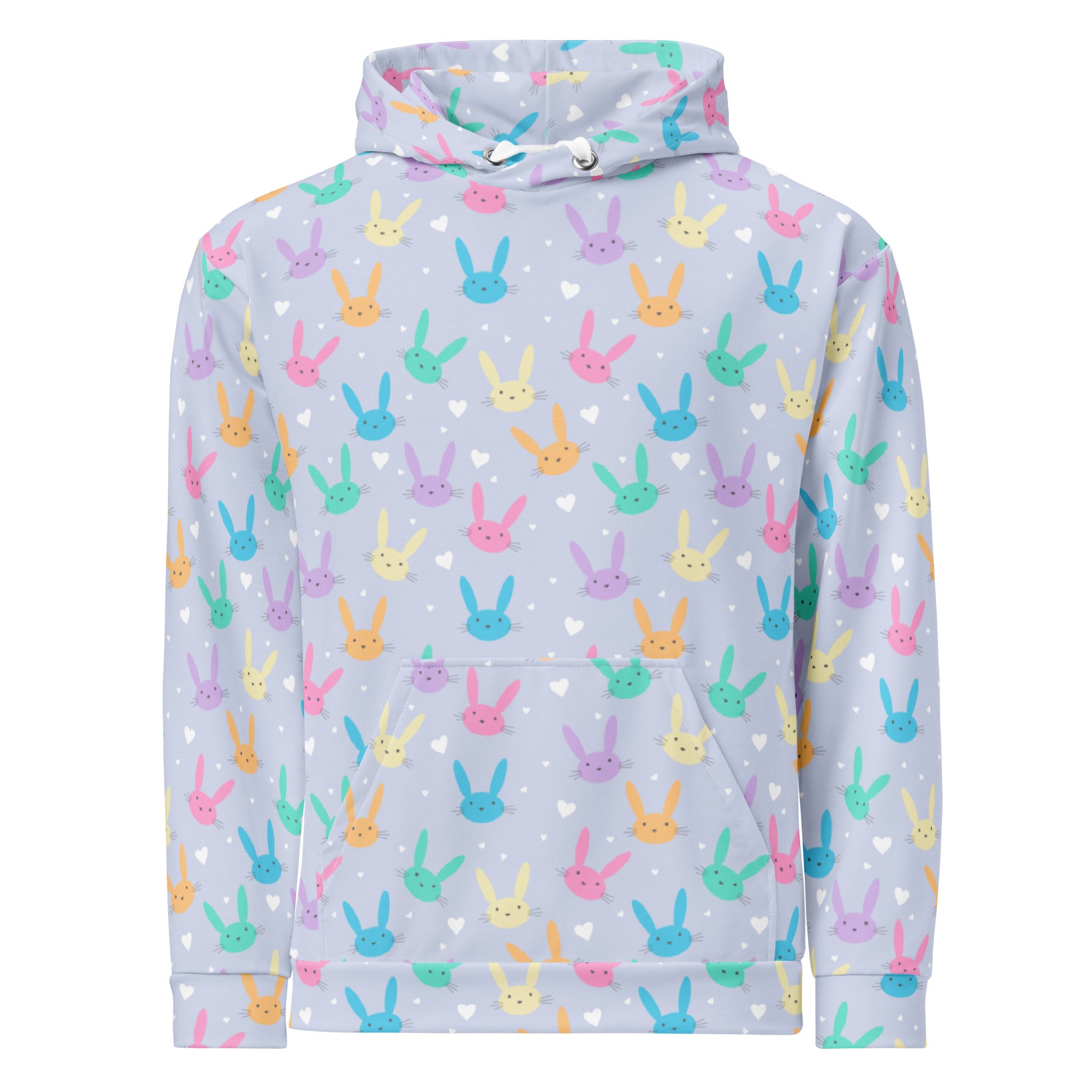 Adorable pastel colored bunnies adorn this pale purple print. Tiny white hearts are scattered around them to create a print that is kawaii.