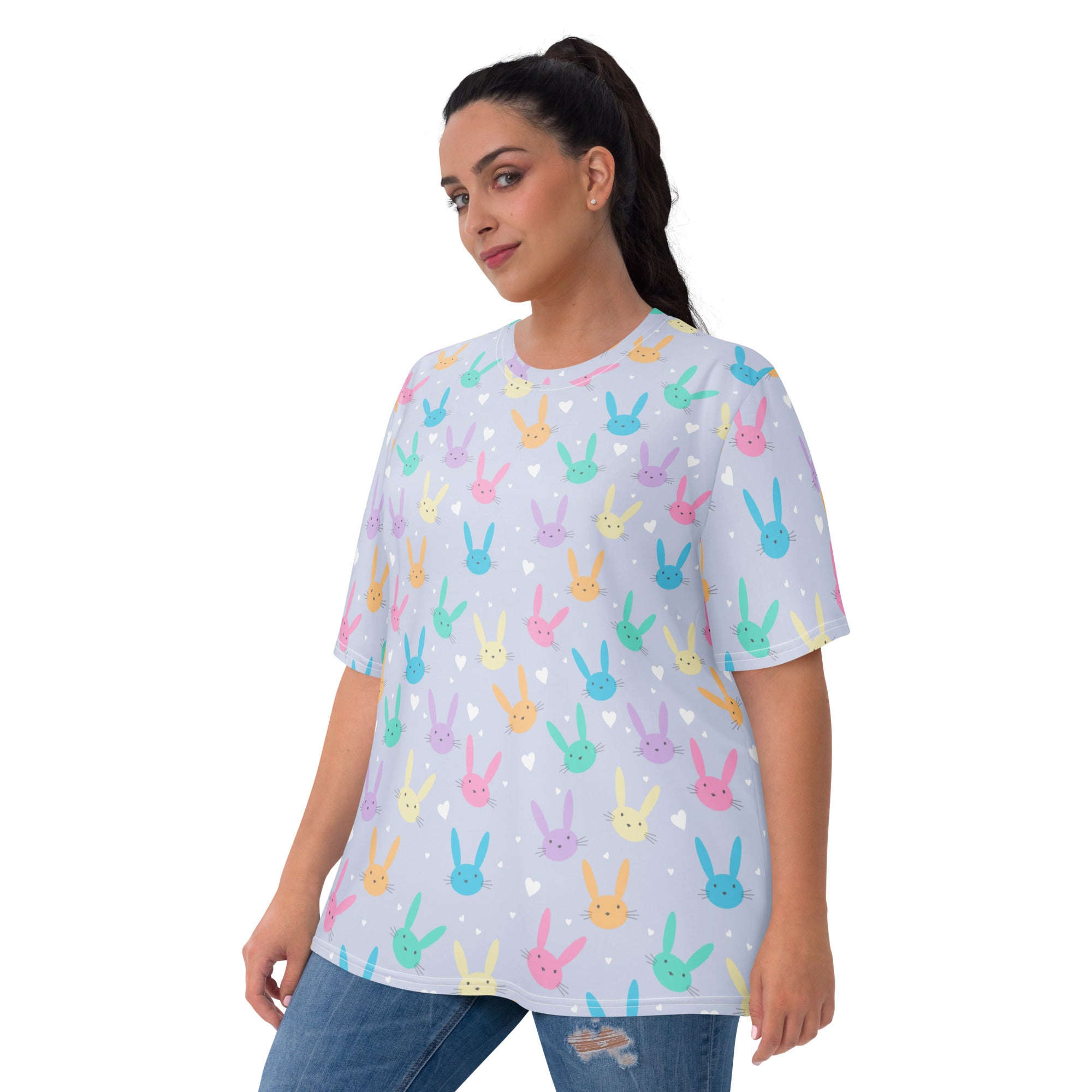 Adorable pastel colored bunnies adorn this pale purple print. Tiny white hearts are scattered around them to create a print that is kawaii.