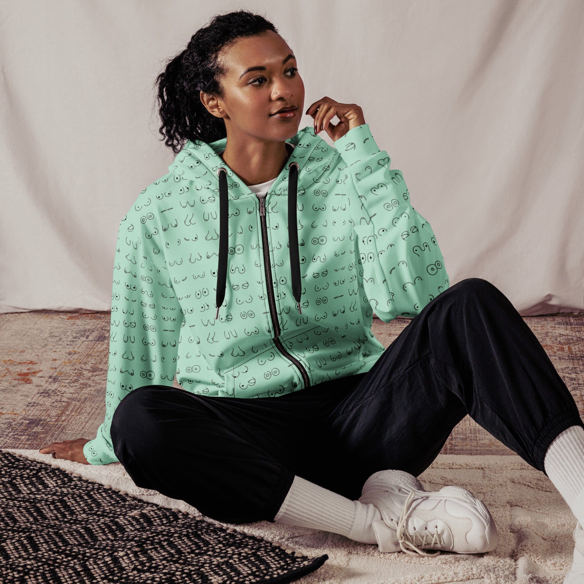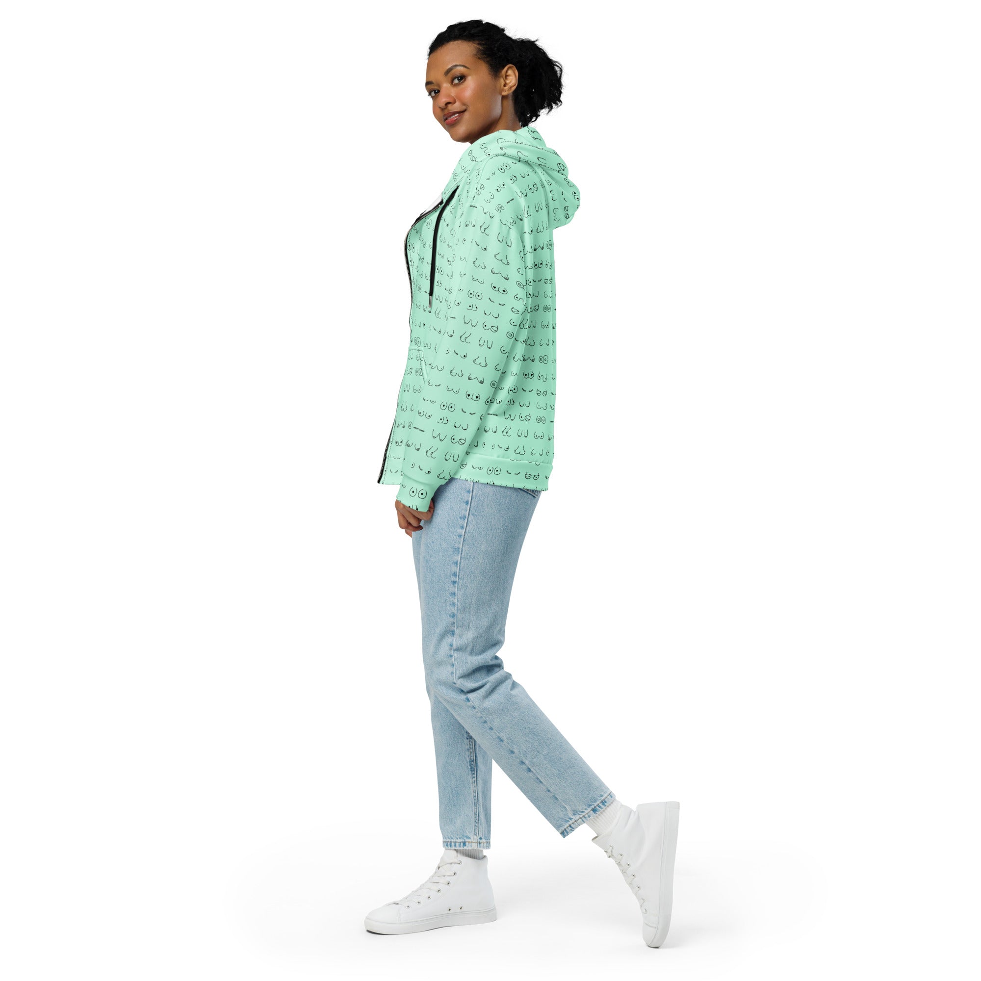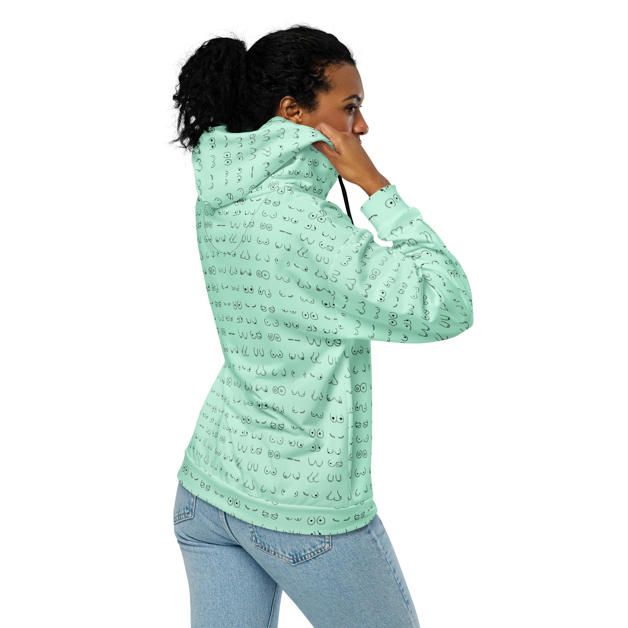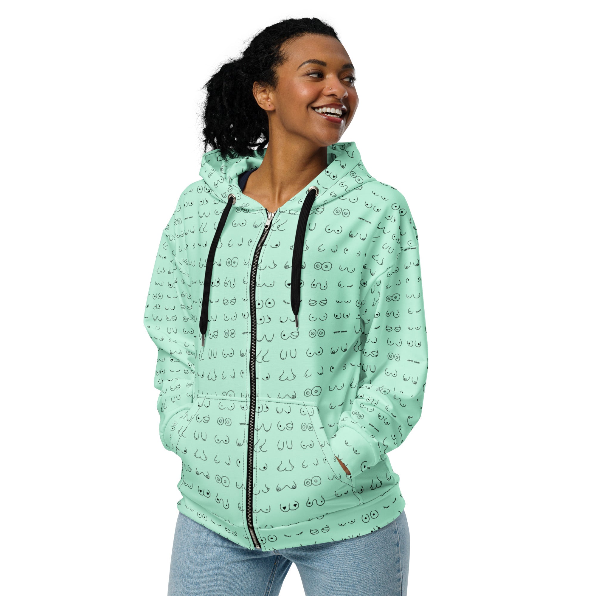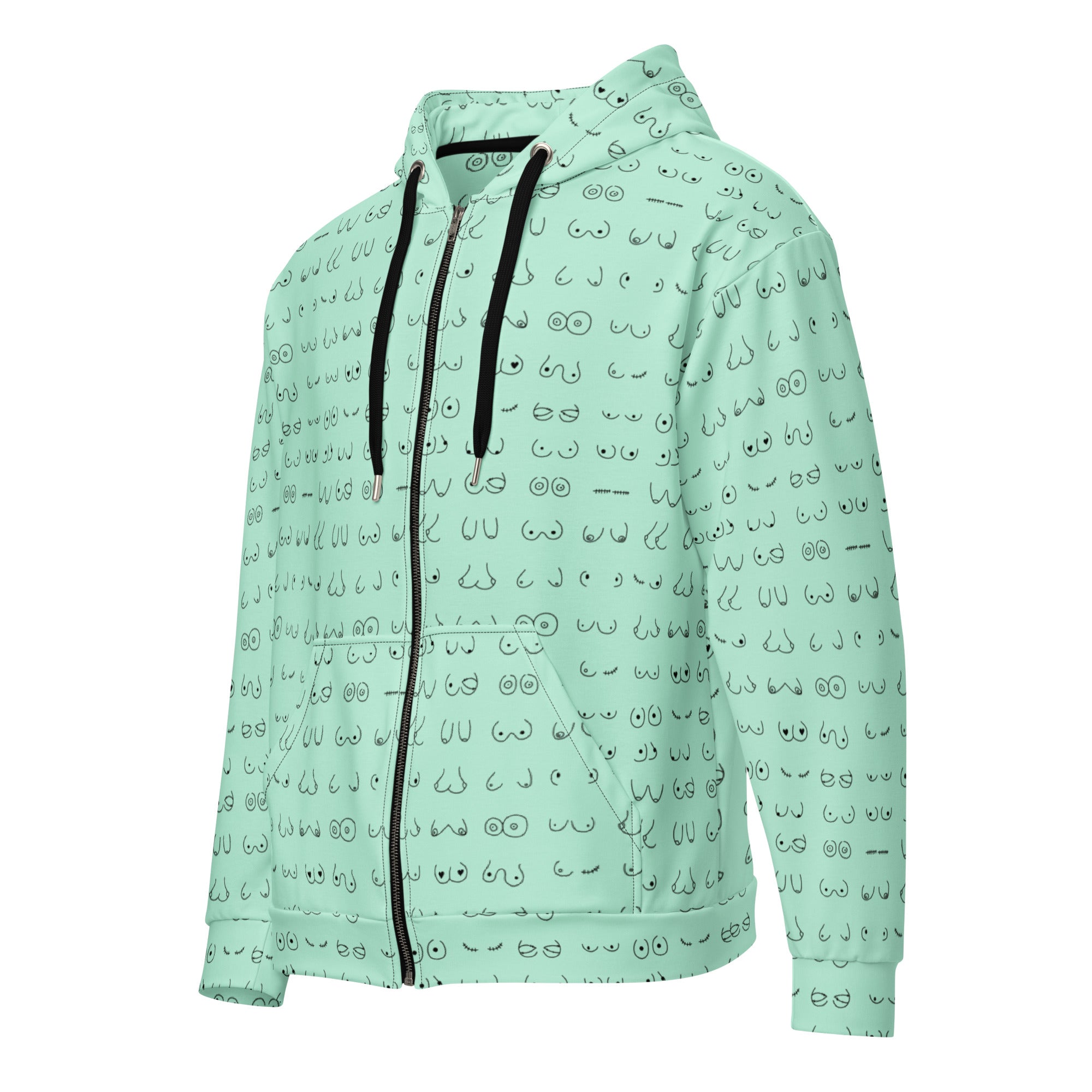 Every pair is the perfect pair. Old or new. Original, modified or both. Those ladies have given you hell so slip on something comfy and relax for a bit. This print is a minty green background with all sorts of boobies in black.