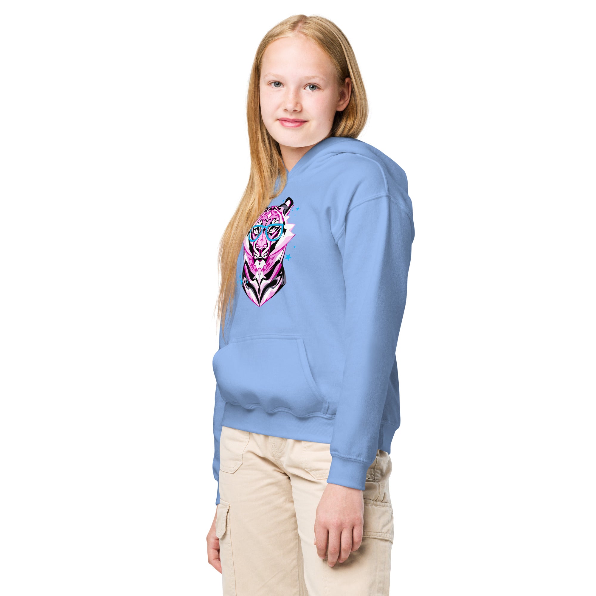 A stunning pink tiger with bright blue glasses. She knows she looks good.