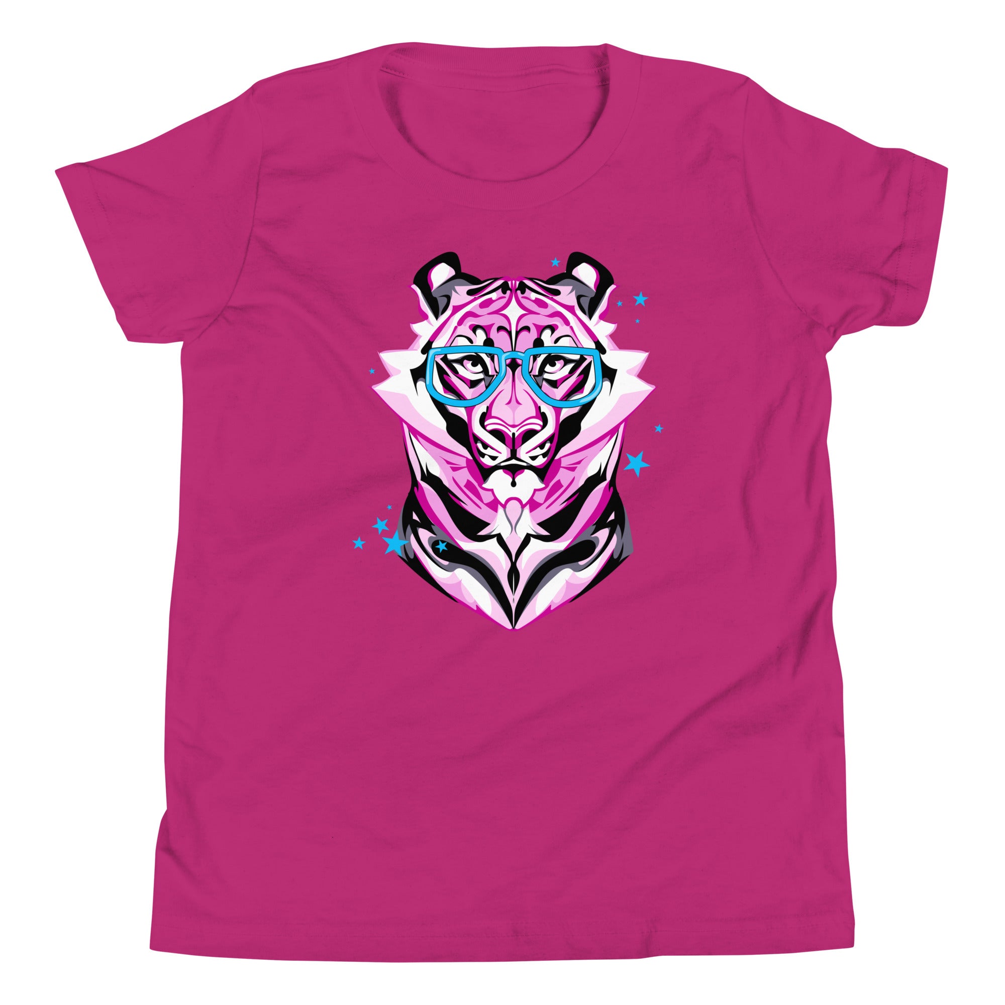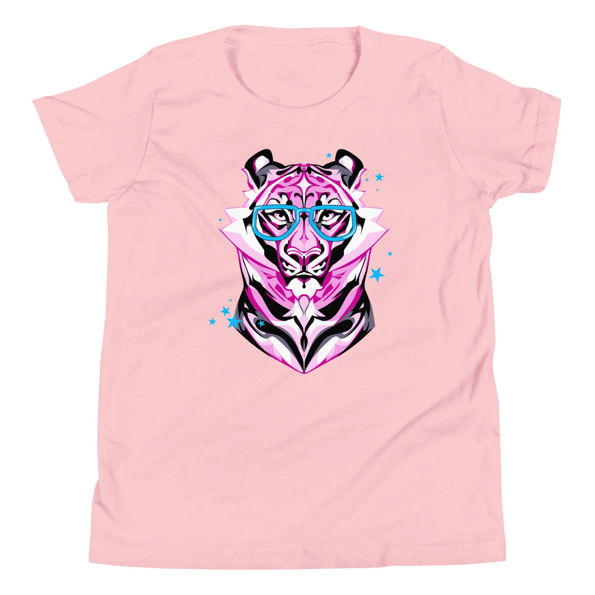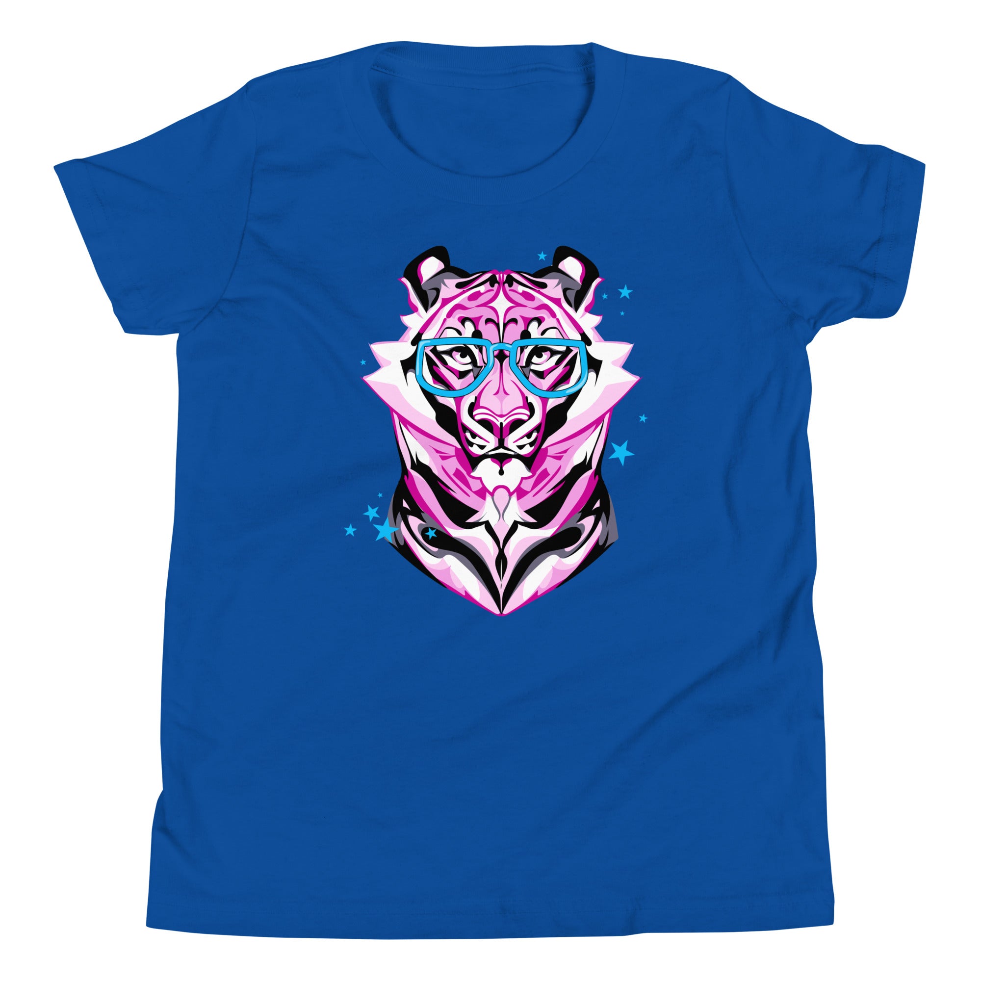 A stunning pink tiger with bright blue glasses. She knows she looks good.