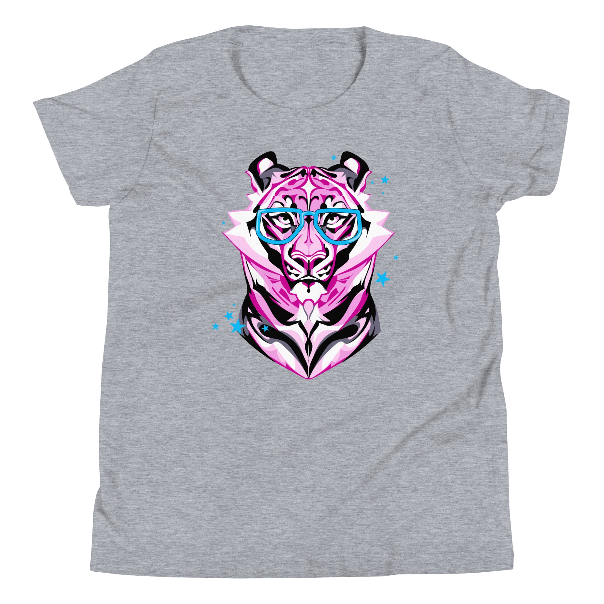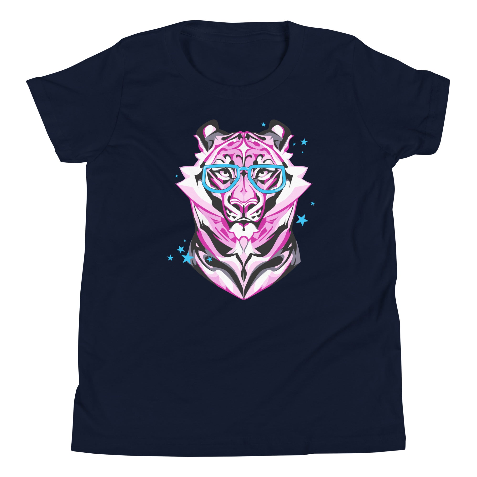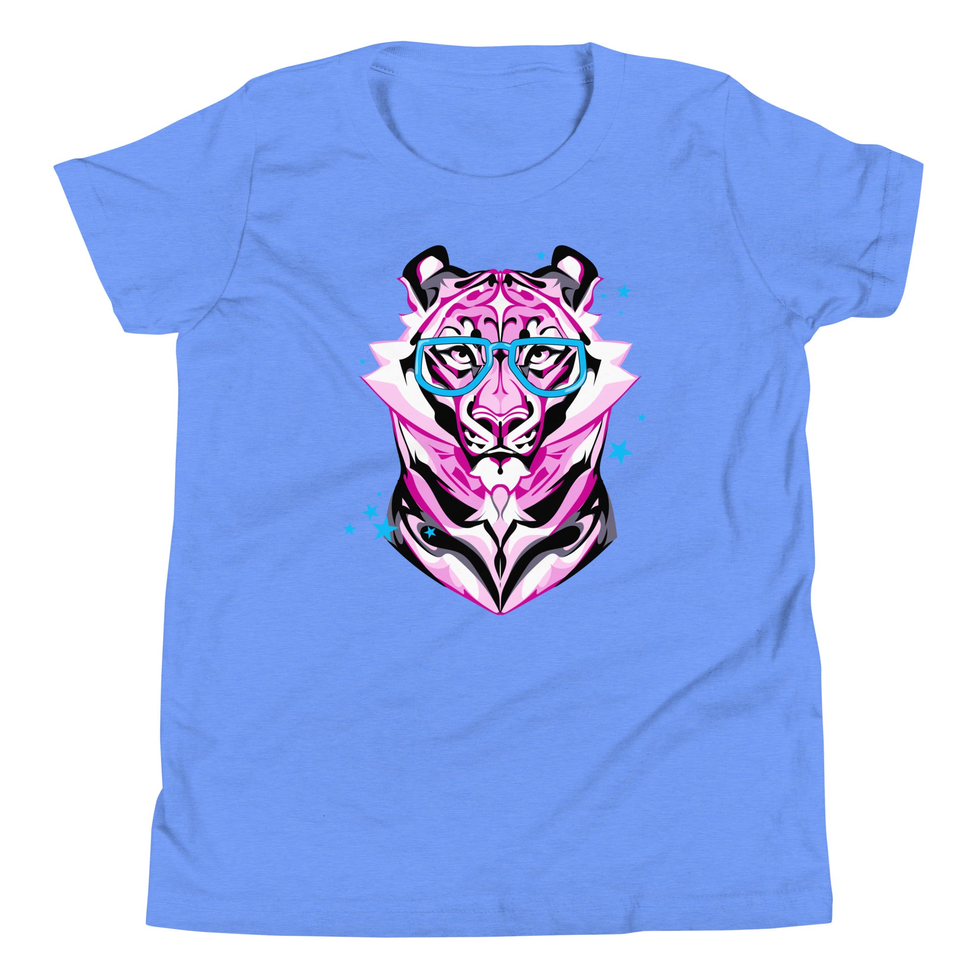 A stunning pink tiger with bright blue glasses. She knows she looks good.
