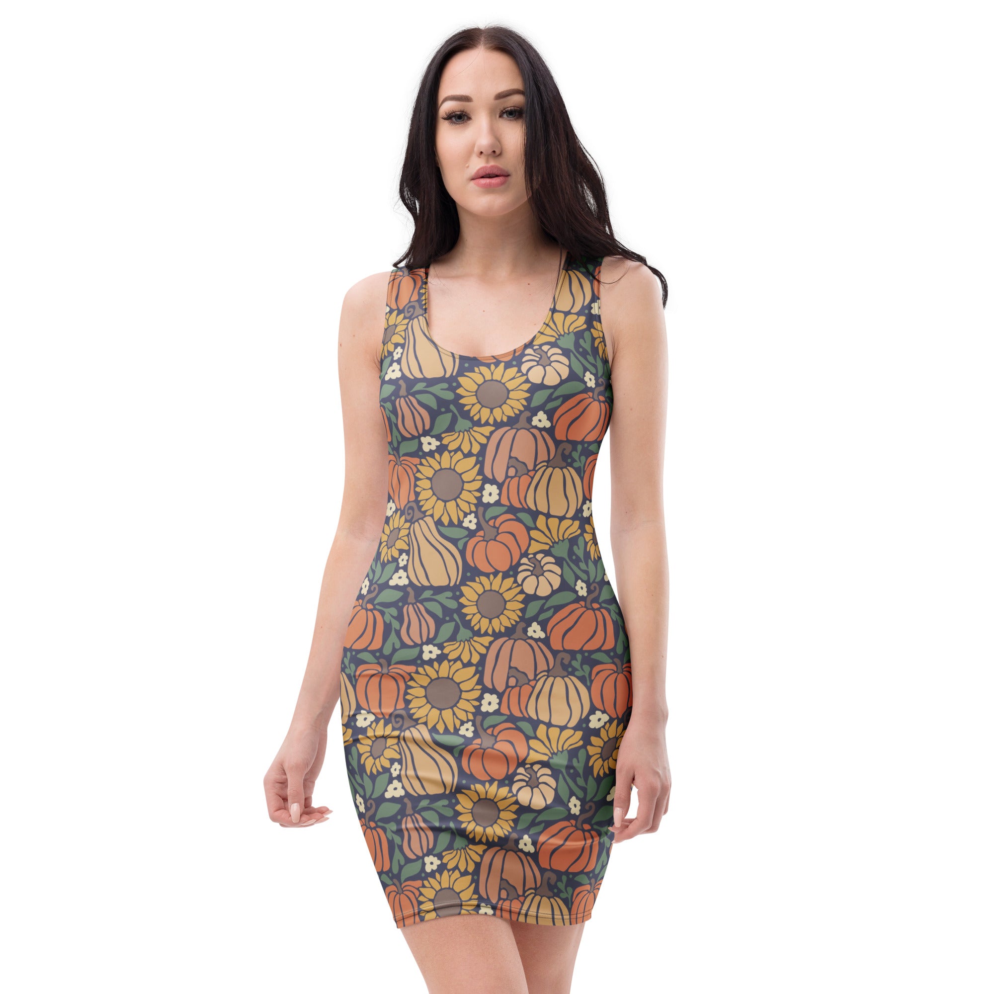 A bright and happy pumpkin and sunflower print that is perfect to wear for all your fall events.