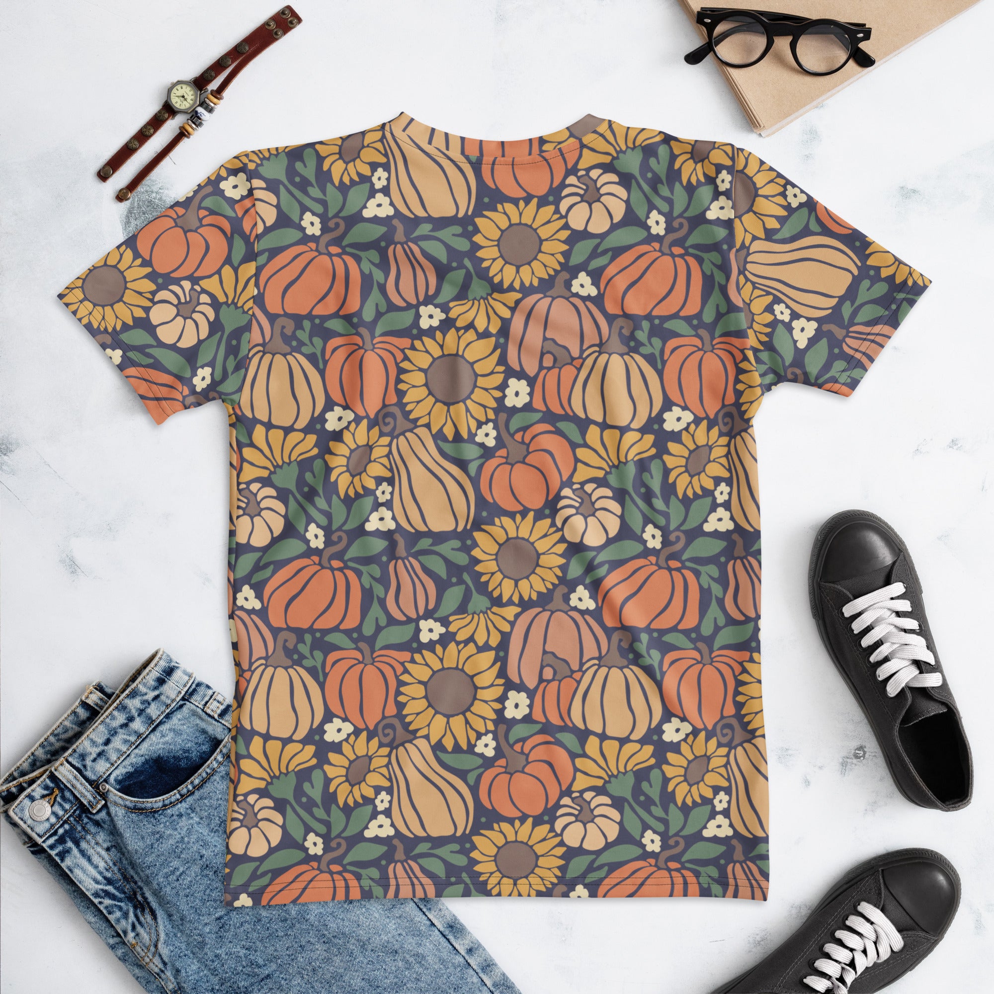 A bright and happy pumpkin and sunflower print that is perfect to wear for all your fall events.