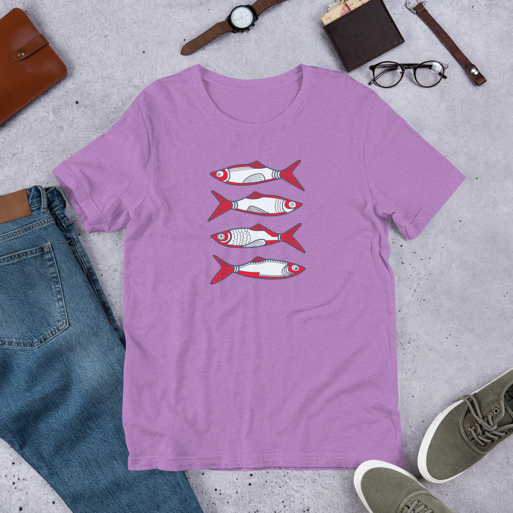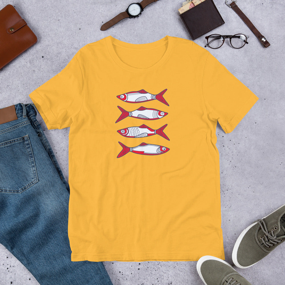 A fun stack of these stylized sardines. This group of 4 fish creates a graphic pops and adds a bit of whimsy to any outfit.