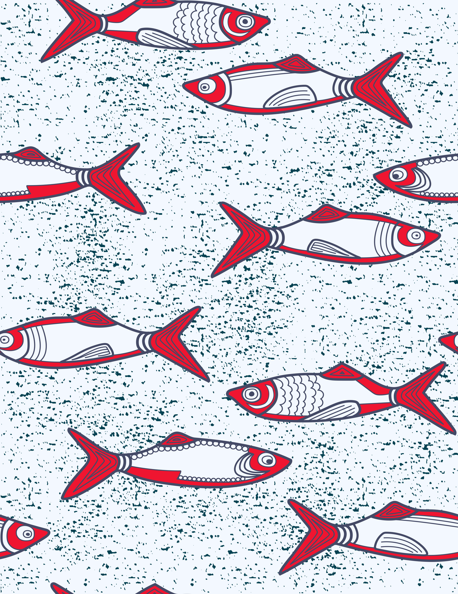 Bright red and blue fish on a speckled background. Playfully fun, this print is designed to make you smile.