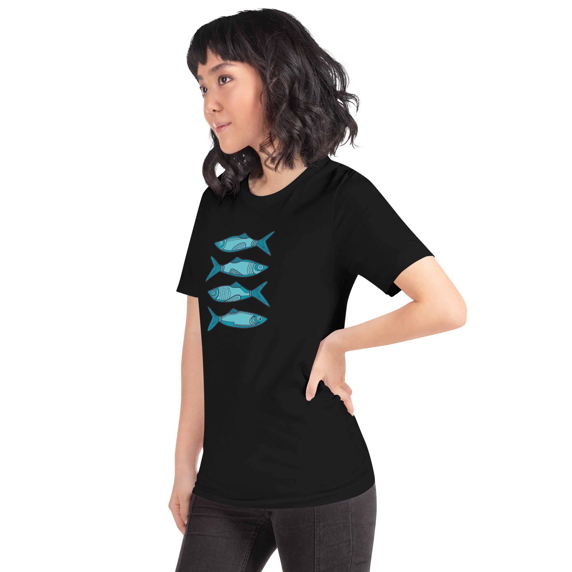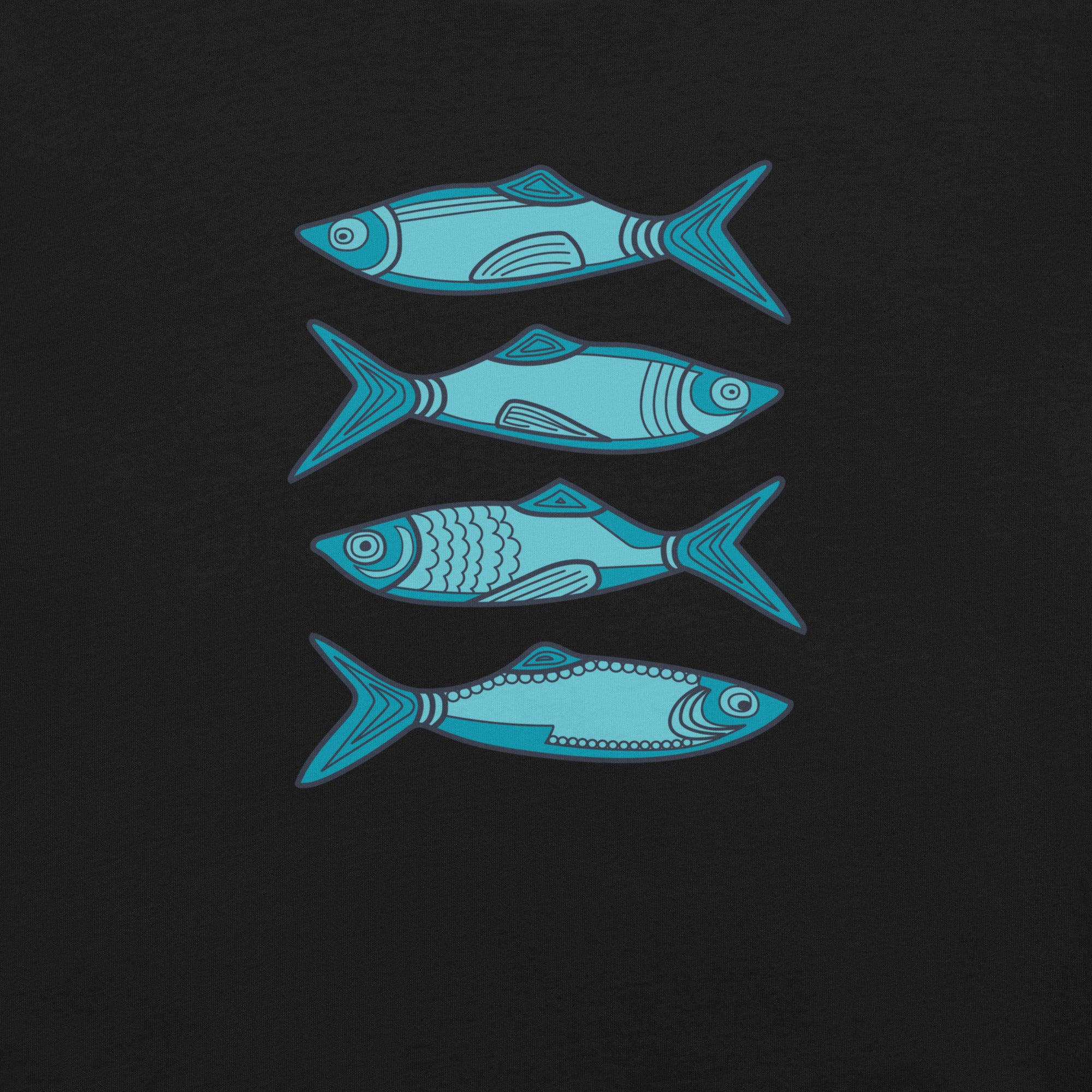 A fun stack of these stylized sardines. This group of 4 fish creates a graphic pops and adds a bit of whimsy to any outfit.