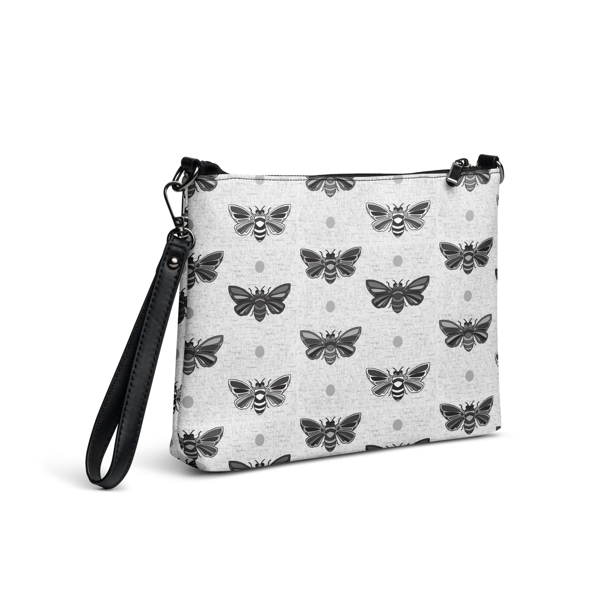 A moth and polka dot print in shades of gray.