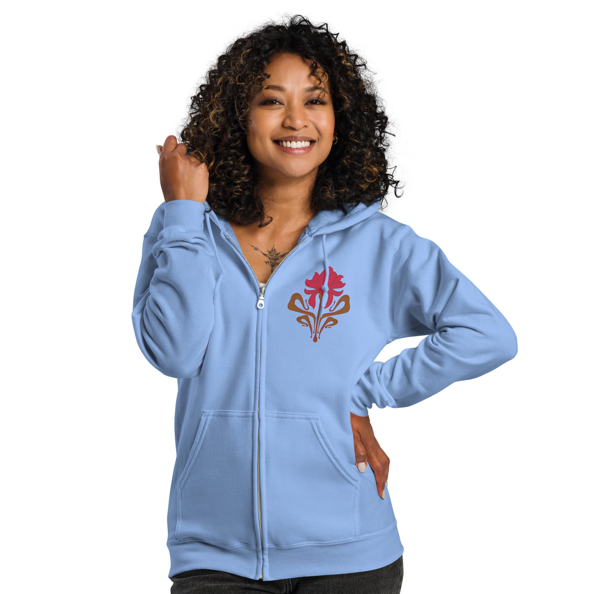 Designed with style and comfort in mind, this hoodie will quickly become your new favorite. It’s made from soft fleece inside and outside, with a sturdy metal zipper, convenient front pockets, and a hood with color-matched drawstrings.