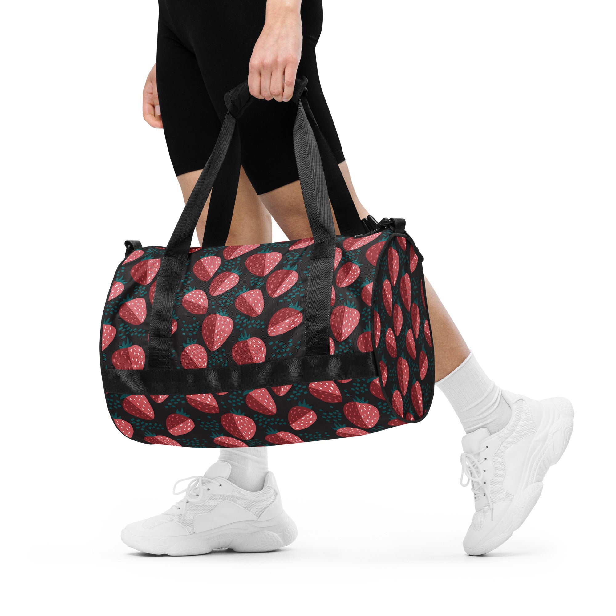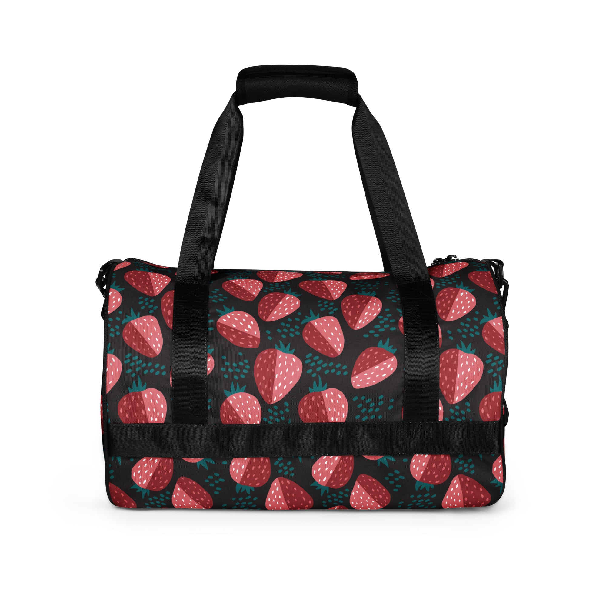 Ready to get your fitness on? Add some punch to pumping iron with this all-over print gym bag. Made from 100% polyester and sturdy, water-resistant fabric, this bag is fun meets function. And it’s got pockets!