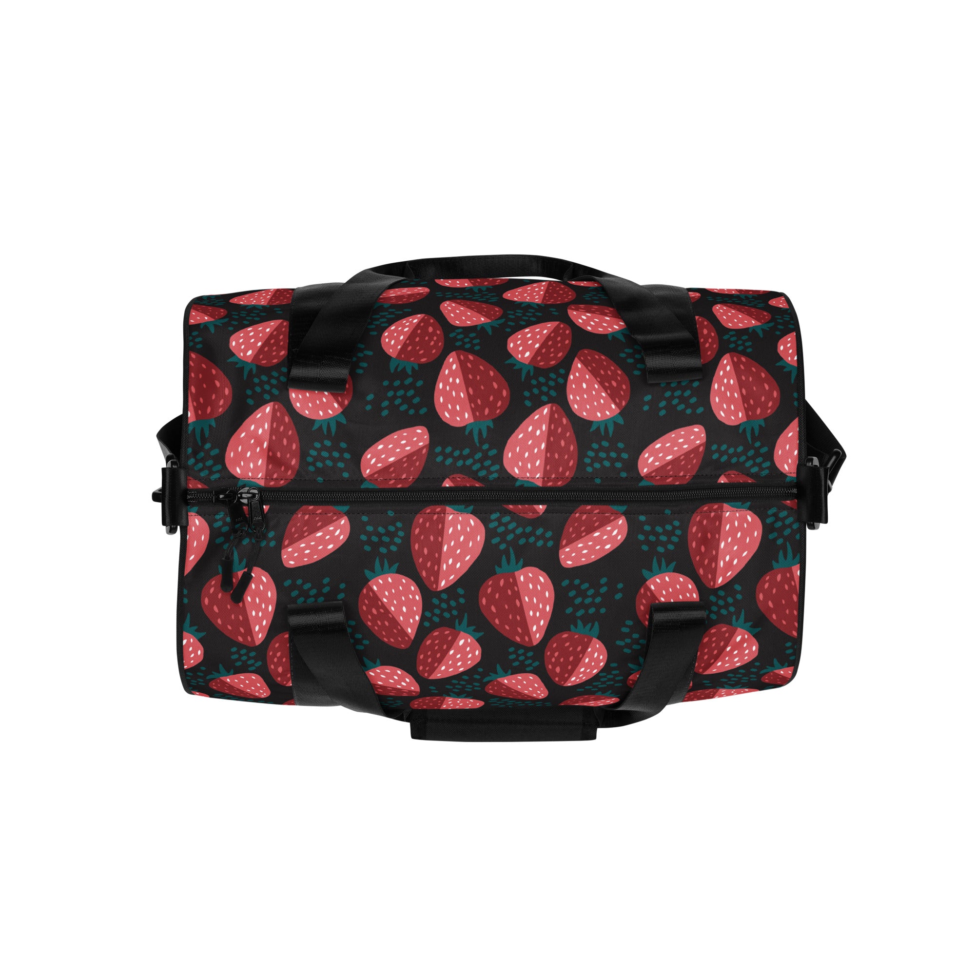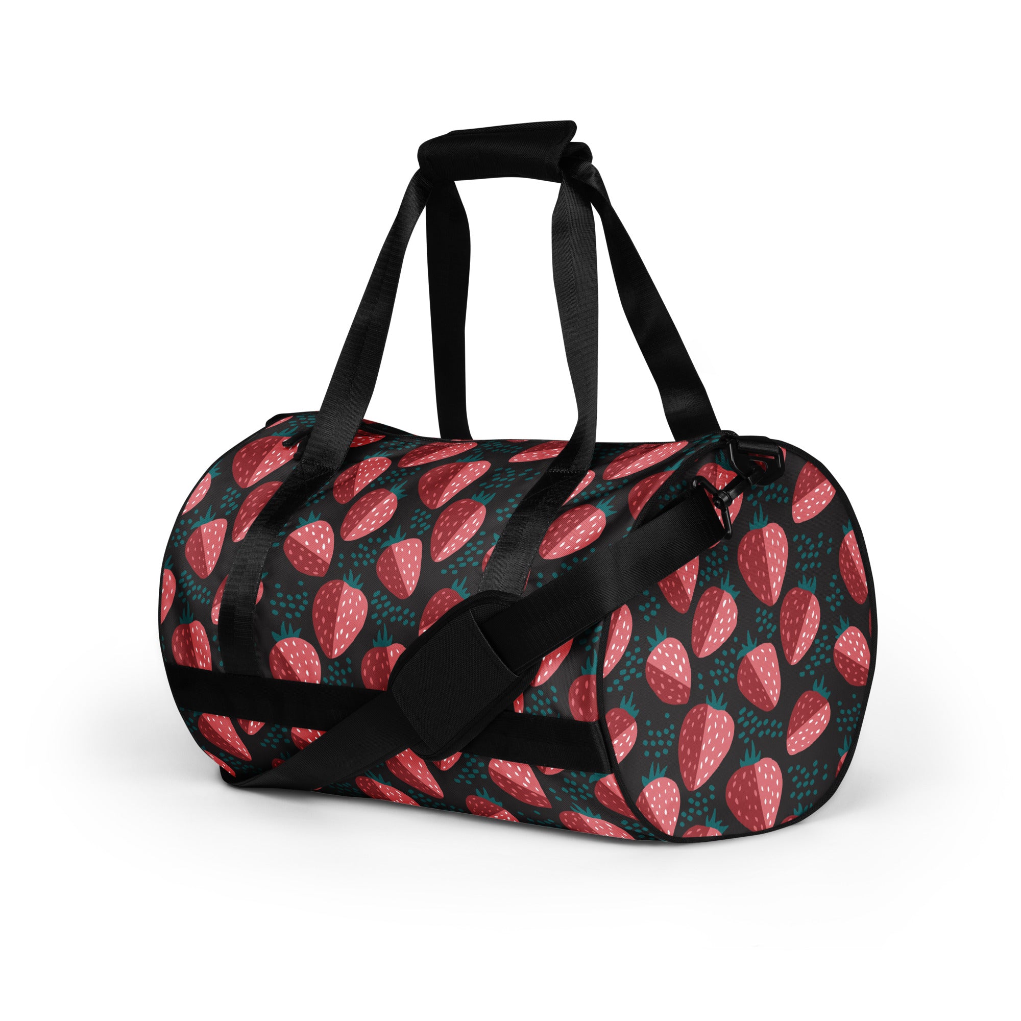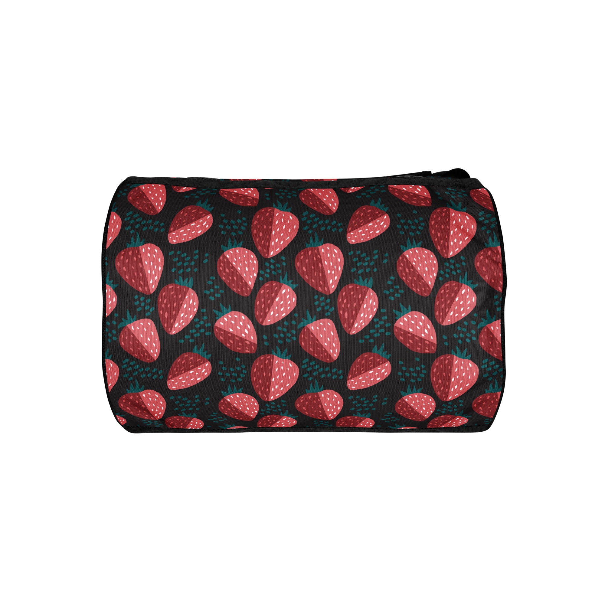 A bold strawberry print on a black background. This fresh print is perfect for spring.