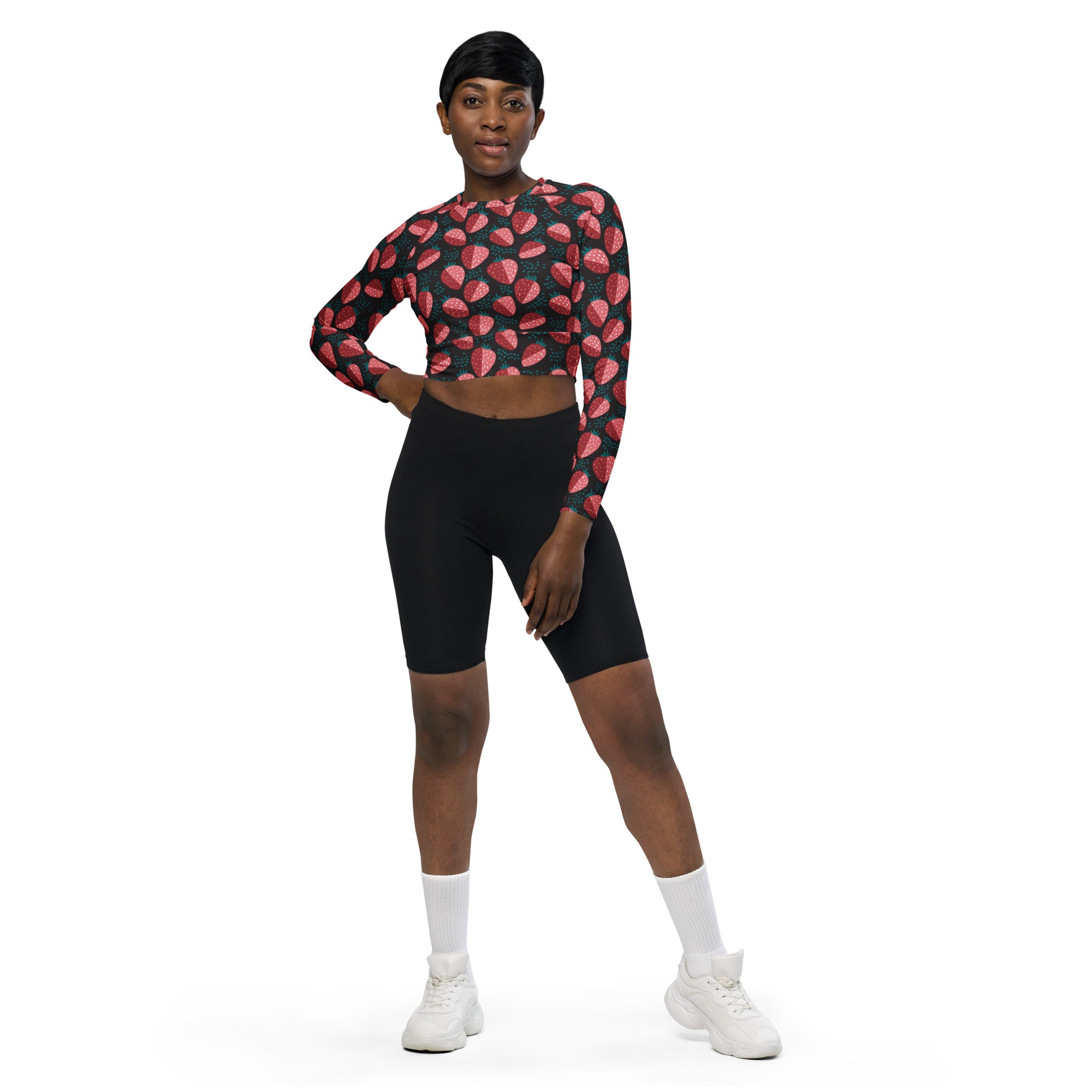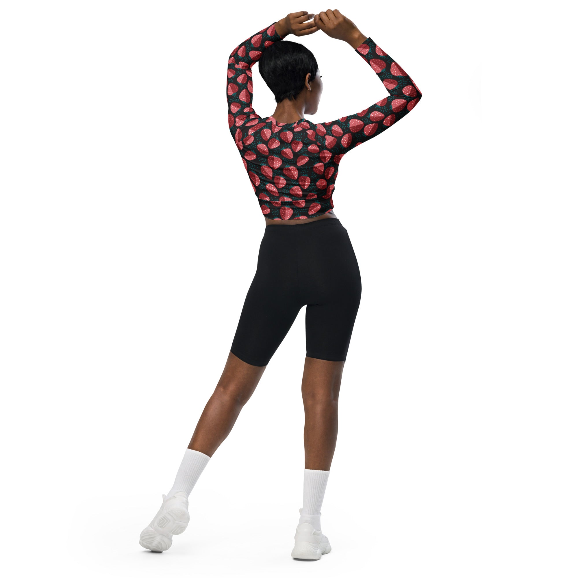 This long-sleeve crop top is made of recycled polyester and elastane, making it an eco-friendly choice for swimming, sports, or athleisure outfits. The crop top has a tear-away care label and a wide, double-layered waistline band for a comfortable fit.