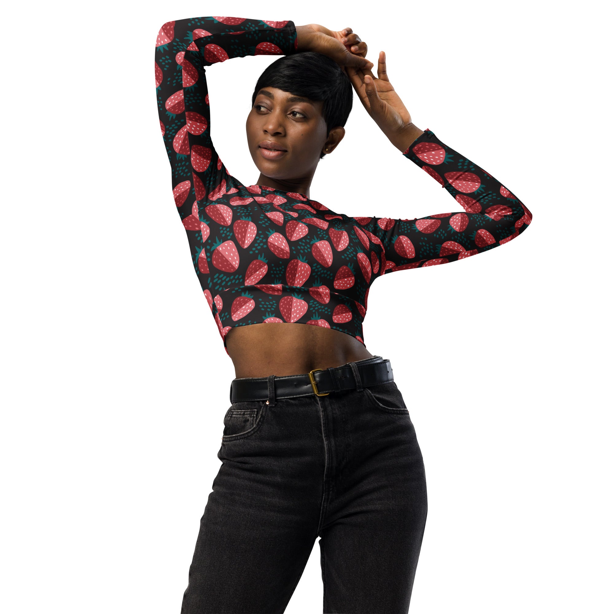 A bold strawberry print on a black background. This fresh print is perfect for spring.