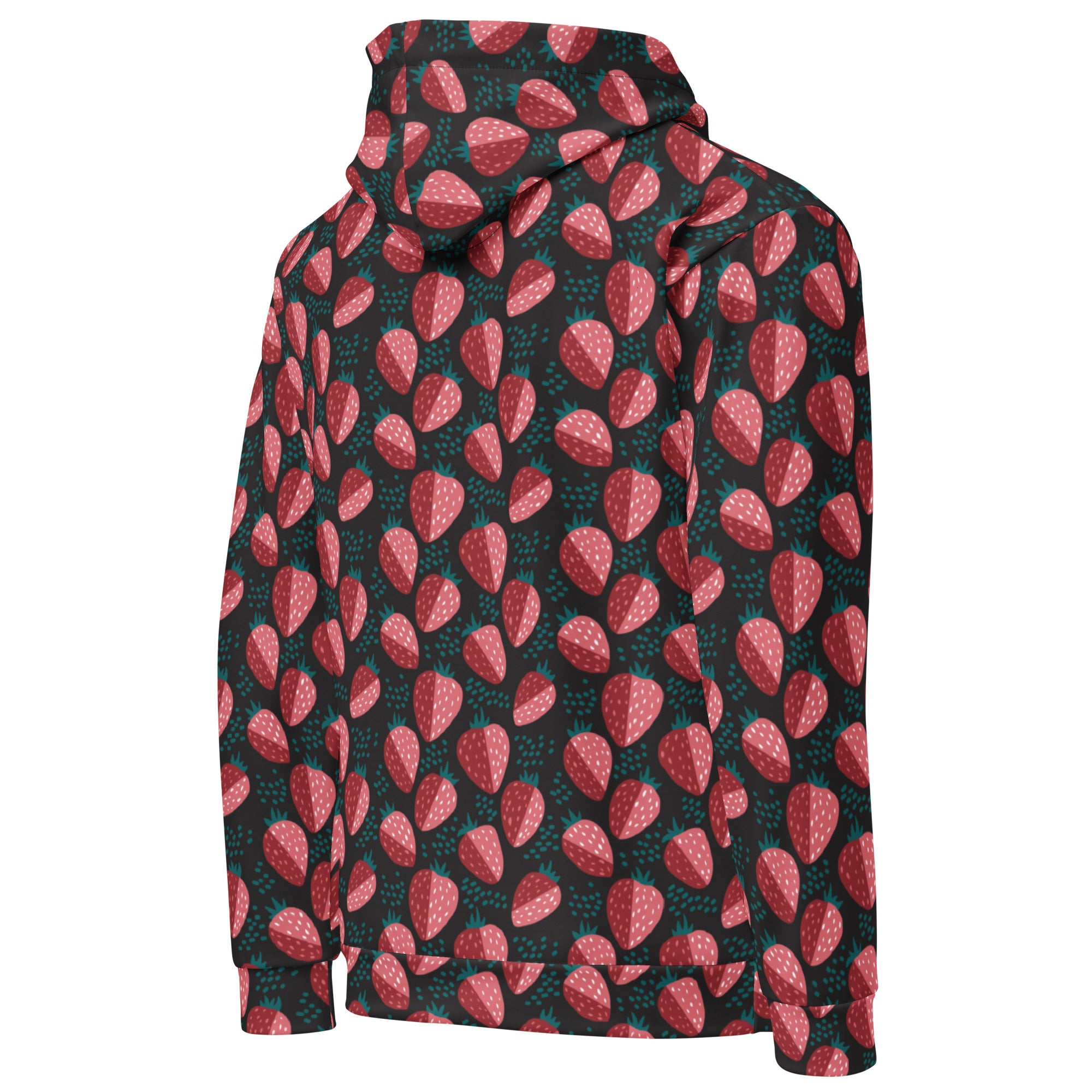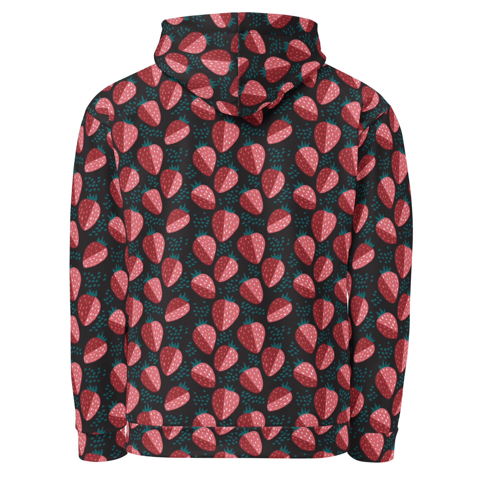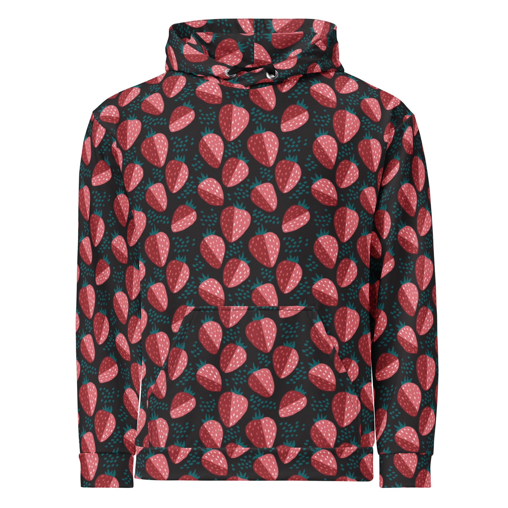 A bold strawberry print on a black background. This fresh print is perfect for spring.
