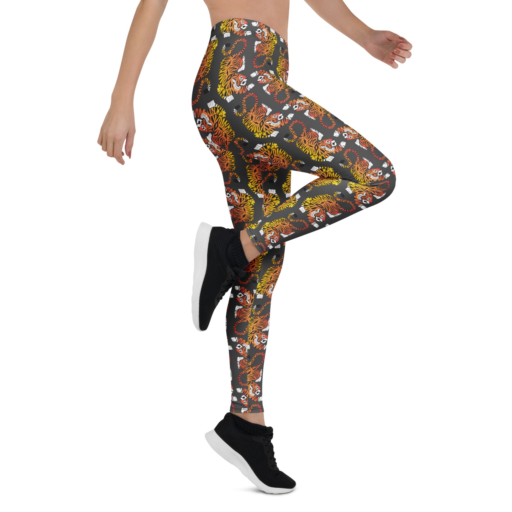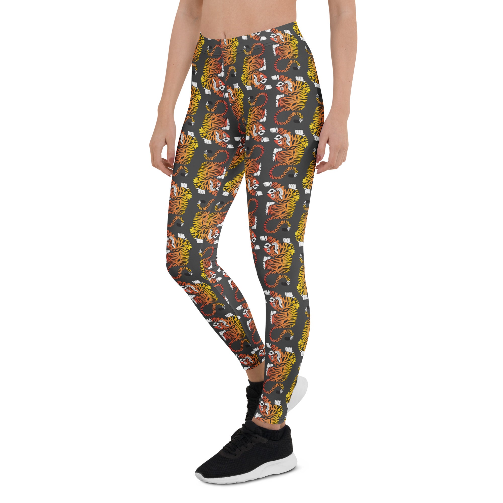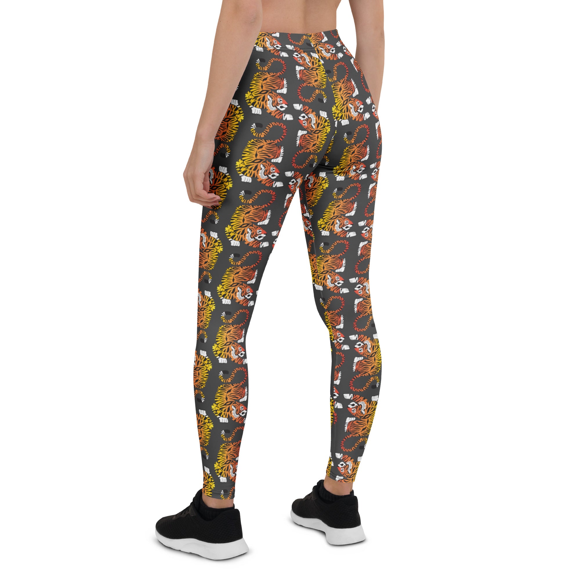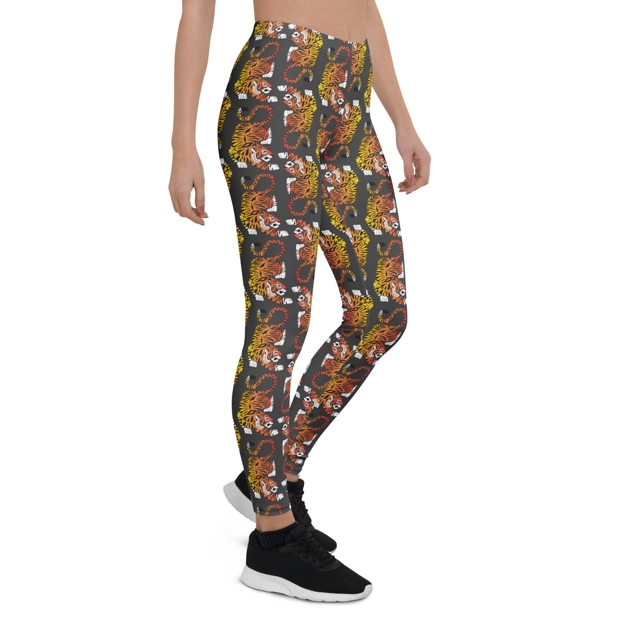 These bold red - orange - yellow. gradient colored tigers pop against a dark gray background. Inspired by vintage tiger prints.