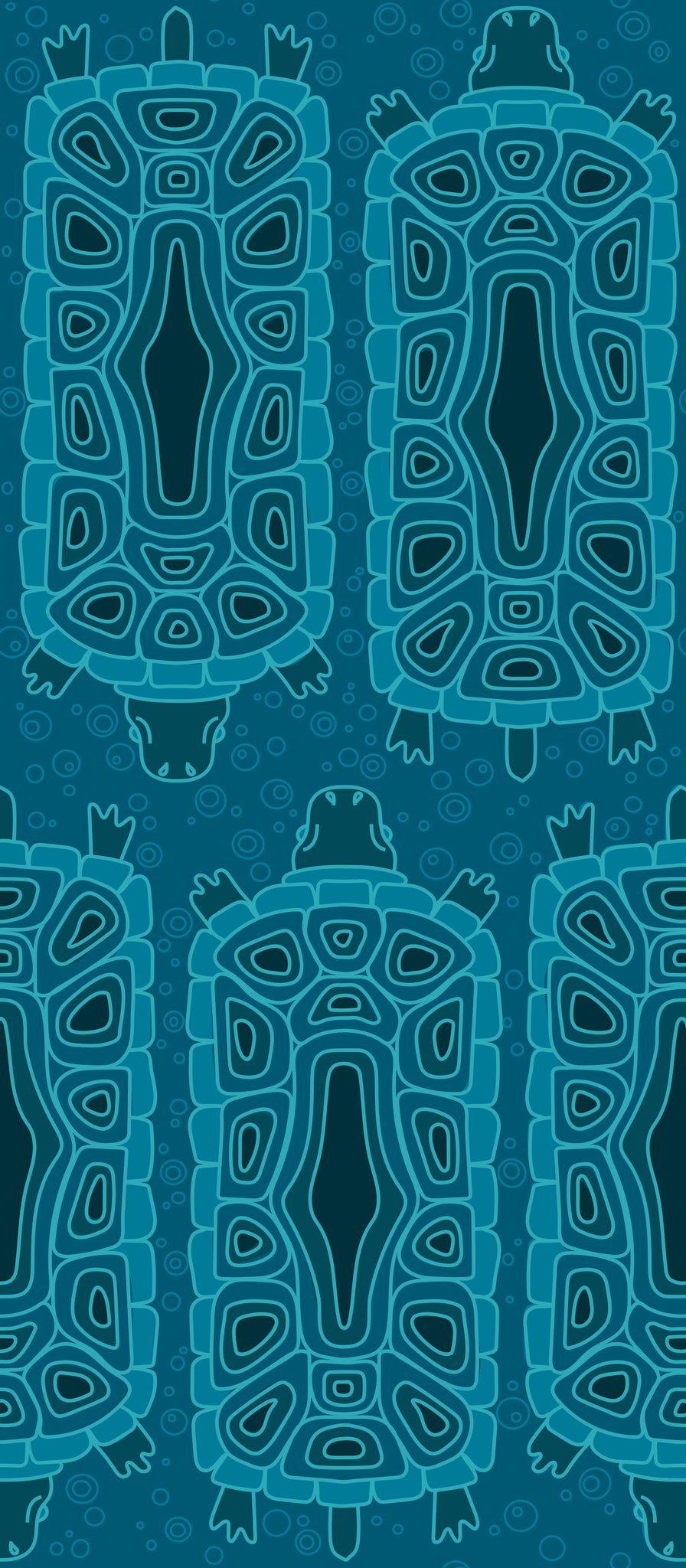 Created in shades of lyons blue, this bold print features stylized tortoise all lined up in rows. Surrounded by bubbles and watery blue.