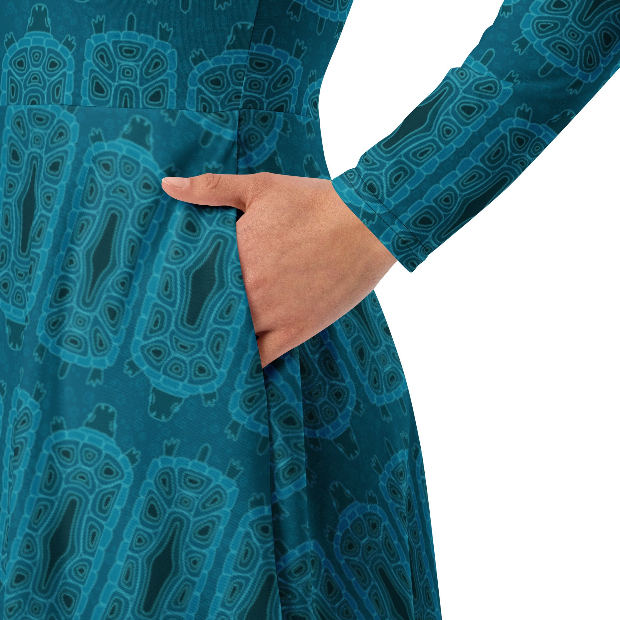 Created in shades of lyons blue, this bold print features stylized tortoise all lined up in rows. Surrounded by bubbles and watery blue.