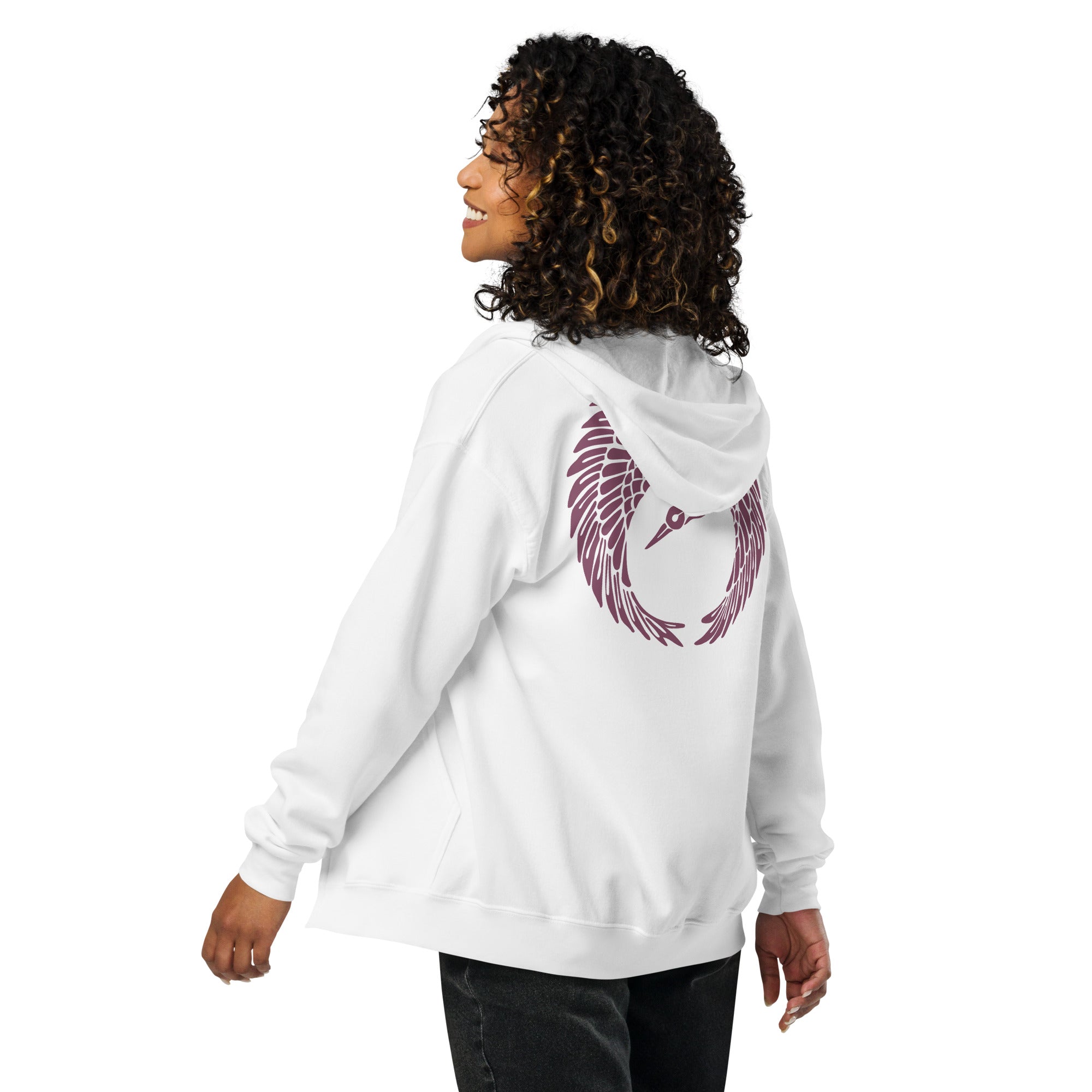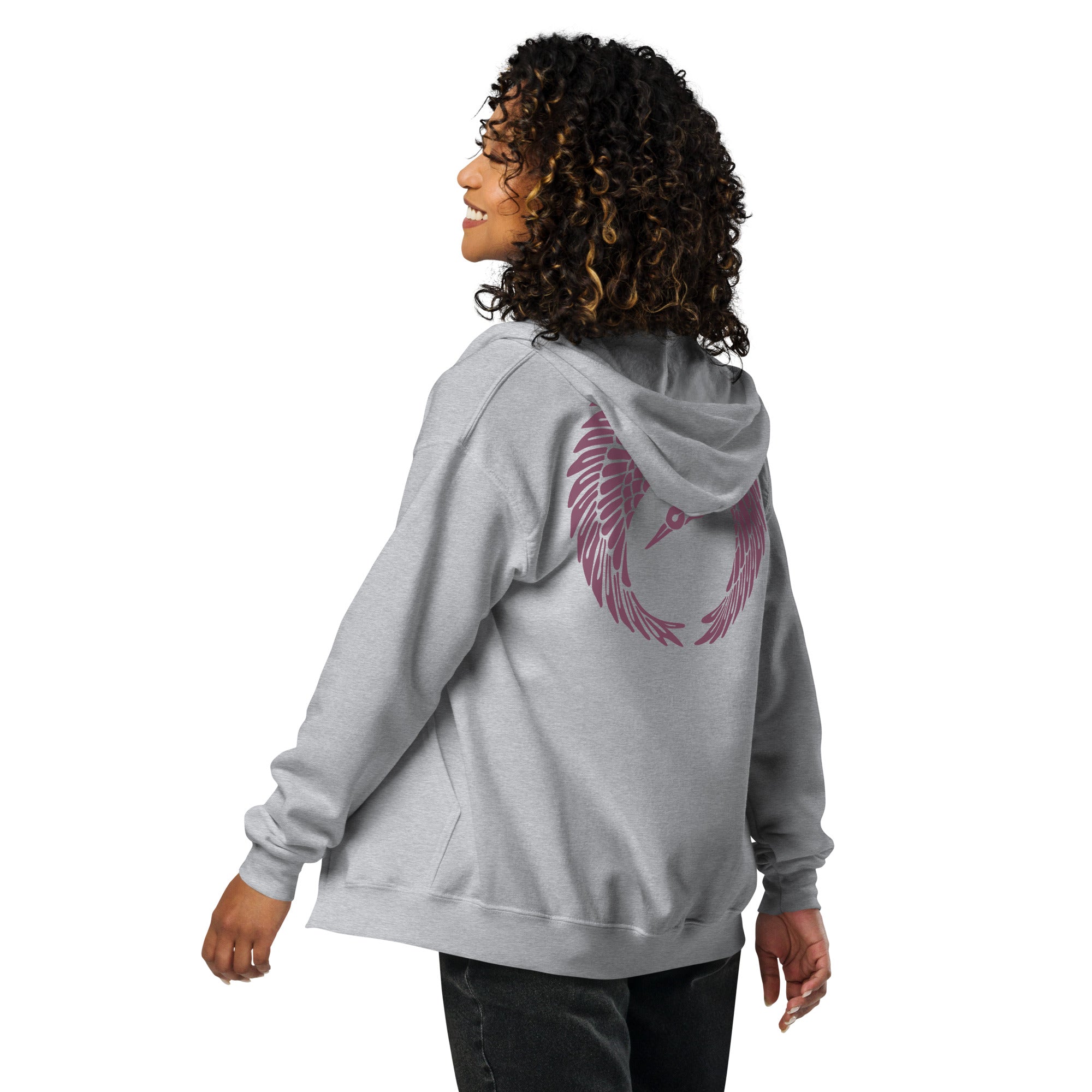 This Art Deco inspired print features a single wine colored crane in a circular print. A smaller pocket size print on the front chest and a larger print on the back.