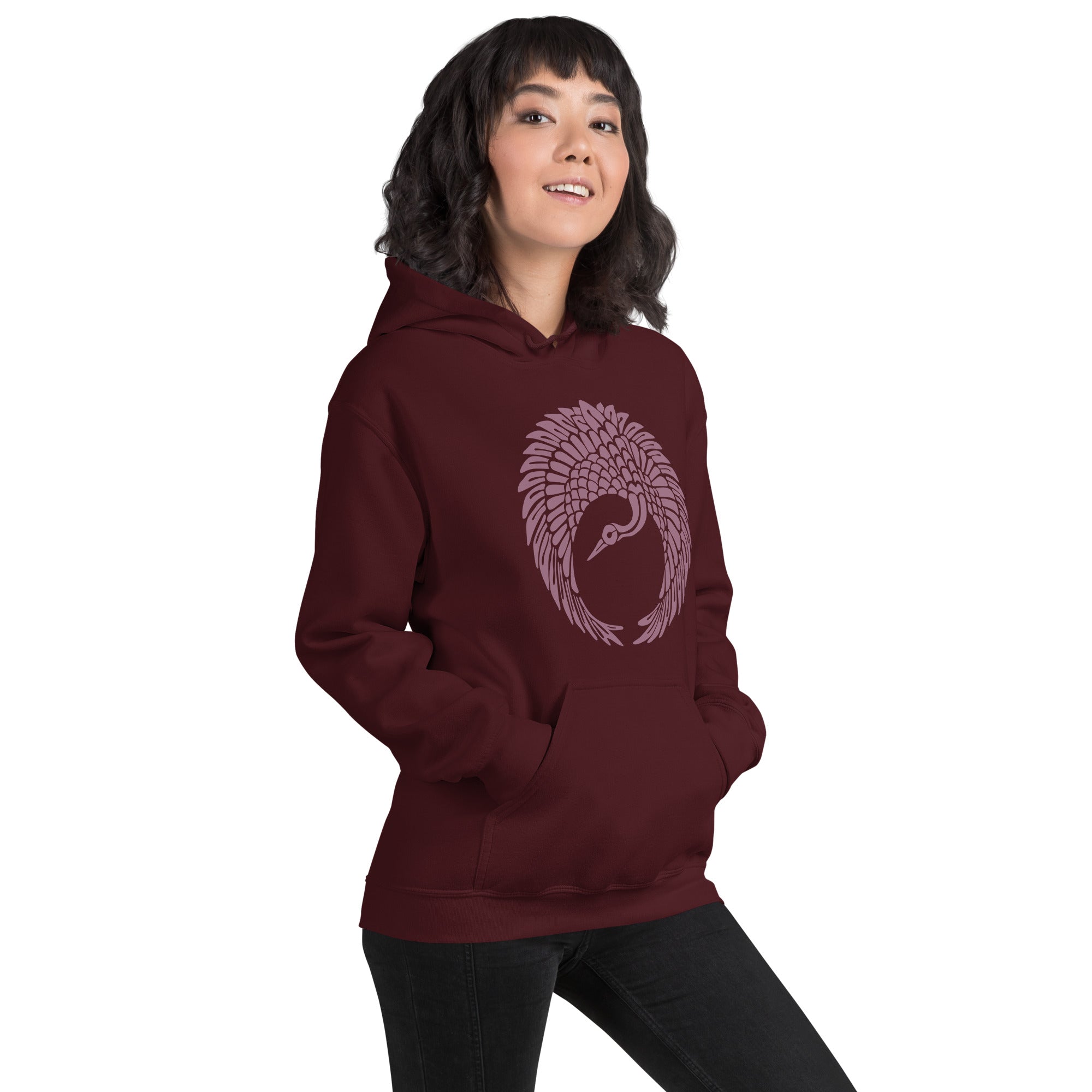 This Art Deco inspired print features a single wine colored crane in a circular print.