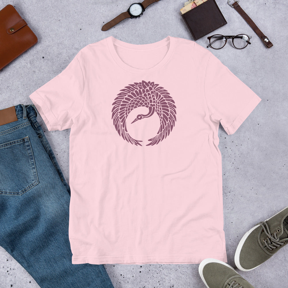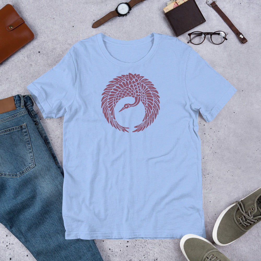 This Art Deco inspired print features a single wine colored crane in a circular print.